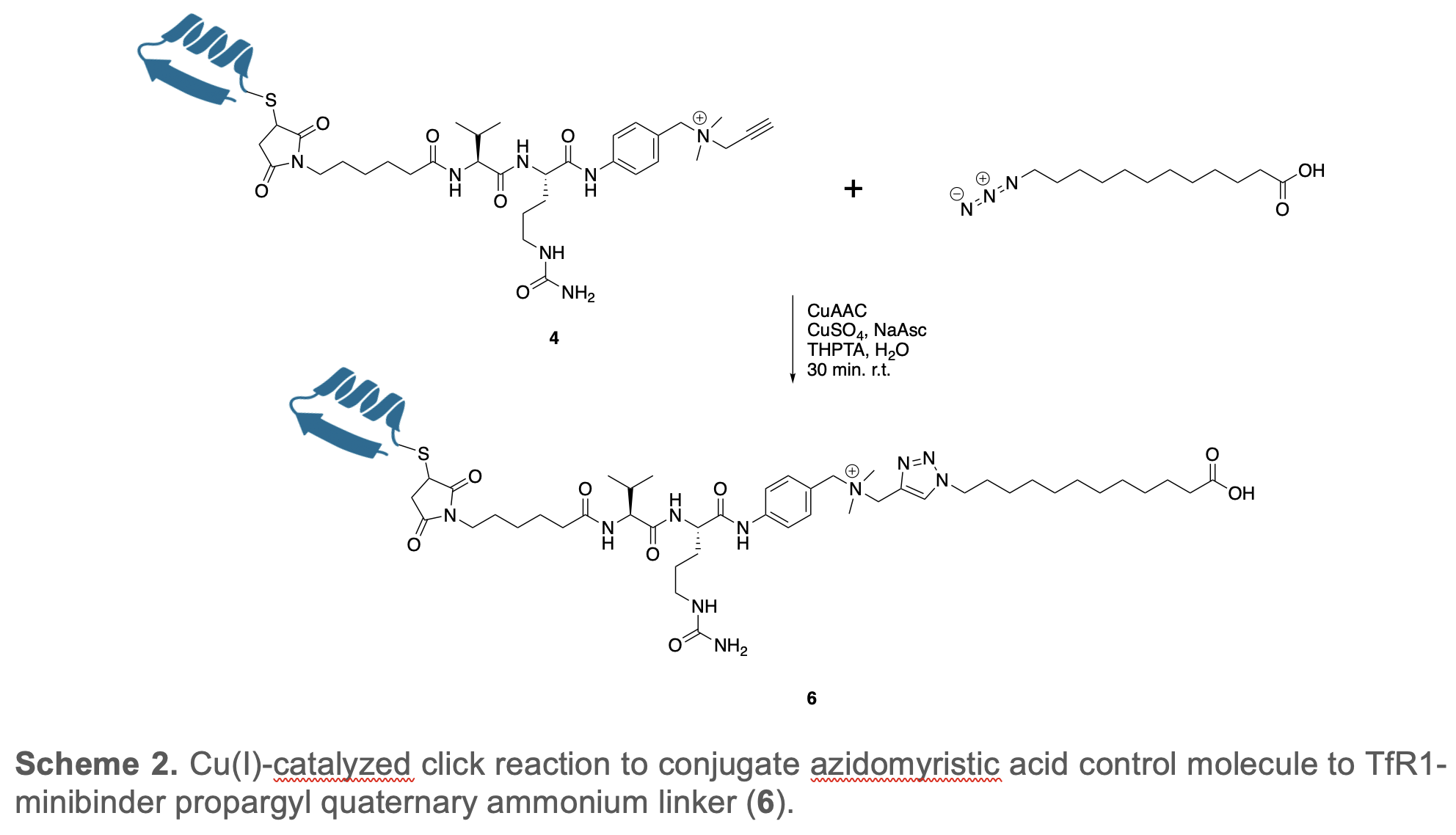 Outcome: We have successfully generated molecule 4 and conjugated the protein-linker to a control myristic acid (Scheme 2, molceule 6) that has structural similarity to the azido-modified ASO, provided by commercial sources (Integrated DNA Technologies, IDT). Conjugation of protein-linker to ASO is in progress.