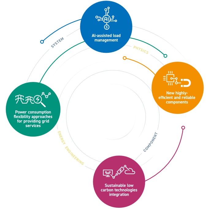 The project aims to transform the way research accelerators are operated by targeting solutions from component to system level, both at experimental physics and energy engineering level. Its objectives focus on reducing energy consumption and enabling the integration of sustainable energy sources. At the component level, the consortium is developing more efficient permanent magnet solutions for dipoles and quadrupoles, and highly efficient Solid-State Amplifiers as radiofrequency sources for two common frequencies, 500MHz and 1.5GHz. Fast grid measurement systems, such as Phasor Measurement Units, are being integrated into accelerator distribution grids to detect major severe disturbances and allow faster and more effective countermeasures. At the system level, the integration of renewable energy sources, coordinated with energy storage solutions, allows improved use of local green energy, rather than relying solely on grid supply. Finally, the development of intelligent control algorithms and digitalization, such as Digital Twins, enables more flexible energy consumption during accelerator and connected data centres operations.