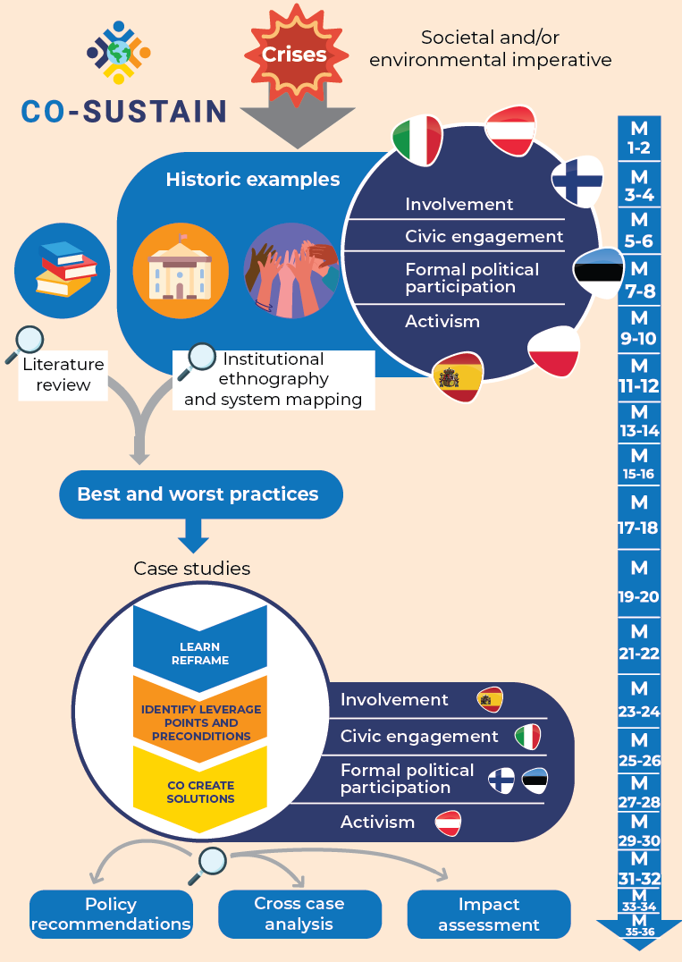 In order for its ambition to be fulfilled, CO-SUSTAIN develops an innovative theoretical framework resulting from the combination of the literature on Socio-technical Transition, Collective Action and deliberative and prefigurative democracy. On the methdological side, the projects is focused on the analysis of a wide number of past and current case studies of poltical and civic participation, to which in the project we make reference respectively as Historical Examples and Case Studies. In order fo the case studies to be properly analysies CO-SUSTAIN relies on the inegration of a numebr of different quantitative and qualitative methods and tools spanning from Stakeholder Analysis to Particpatory System Mapping, from Institutional Etnography to Social Network Analysis and Gamification.