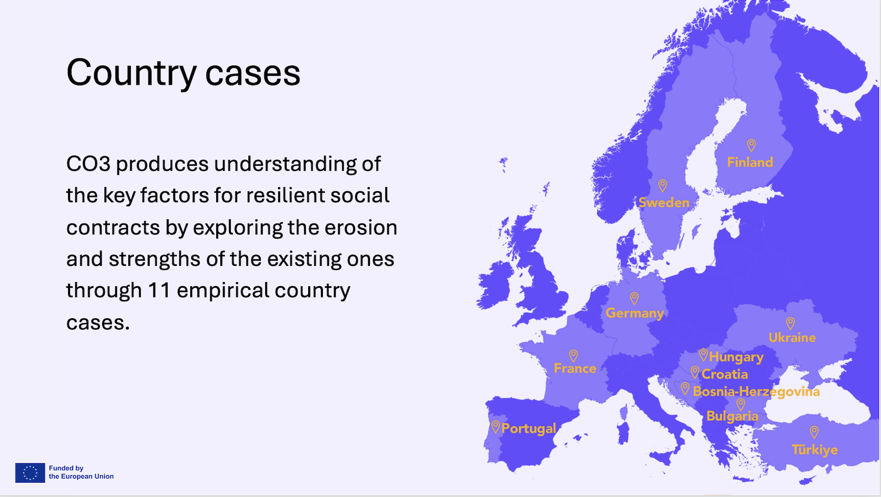 CO3 develops a model and an extensive knowledge base, which enables anticipatory policymaking and supports sensemaking on the construction, dimensions and resilience of social contracts. Central to CO3’s approach are empirical case studies in Finland, Germany, France, Portugal, France, Hungary, Croatia, Bulgaria,Turkey, Ukraine and Bosnia-Herzegovina. CO3 develops scenarios to recognise the mechanisms for reconstruction and safeguards for strengthening democratic social contracts, and generates understanding of how new social contracts can be safeguarded.