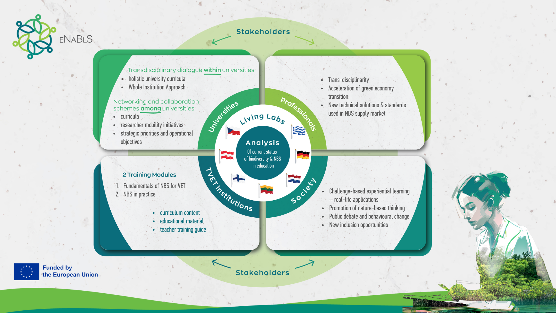 To achieve these objectives, eNaBlS welcomes a plurality of values and knowledge. It also puts emphasis on multi-actor collaboration and a Whole Institution Approach (WIA). In the seven Living Labs (LL) created in Germany, the Netherlands, Finland, Austria, Lithuania, Greece, and the Czech Republic, eNaBlS aims to include all voices.