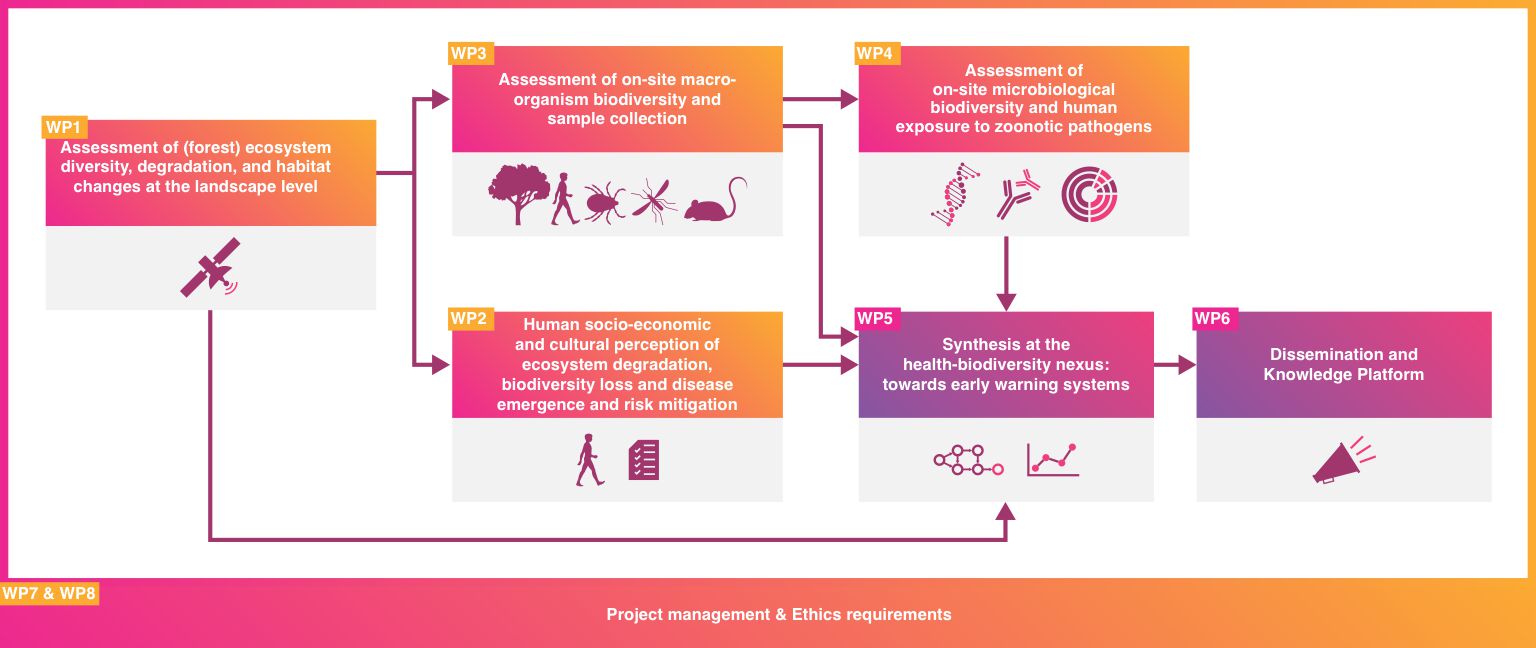 ZOE applies a targeted approach to ensure the generation of reproducible findings and the fine-tuned deciphering of the relationship between biodiversity and disease risk. The project specifically targets the effects of forest degradation and associated biodiversity loss on the risk of emergence of rodent- and vector-borne zoonotic diseases. It uniquely builds on a wide interdisciplinary consortium gathering leading experts in geography, landscape ecology, geobotany, plant, animal, and disease ecology, virology, immunology, epidemiology, modelling, sociology, psychology, anthropology, and science dissemination, from 7 European and 2 Latin American academic partner institutions and 3 associate academic and NGO partners from Mexico and the US.