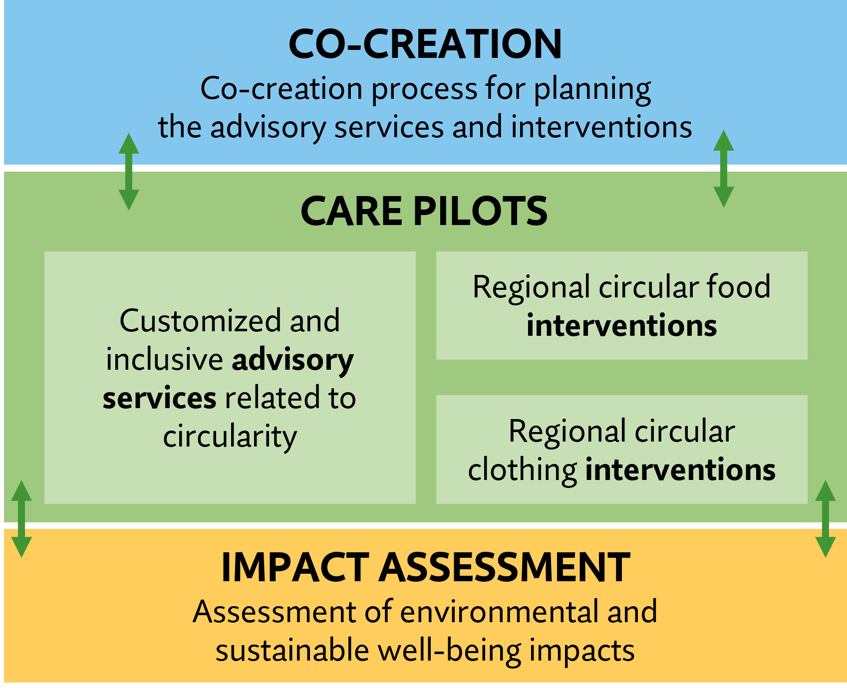 In CARE, two pilots are developed in co-creation with citizens, non-governmental and civil society organizations, municipalities, researchers and CCR regions to facilitate the transformation of households to circularity. One of the pilots is related to food and one to clothing. Both of these material flows represent critical areas for change in consumption from the point of view of their environmental effects. Both CARE pilots consist of two different key parts: interventions and advisory services. In the pilots, households are engaged in changing their everyday practices with the aim to reduce food waste (in the food pilot) and to achieve more sustainable clothing practices (in the clothing pilot). The interventions target the areas of food purchasing and planning, cooking and storing as well as clothes’ washing, repair and redesign, and planning a sustainable wardrobe. In addition, households will receive customized advisory services to support the changes they make in their everyday life. The CARE pilots will be tested and validated in five regions - both urban and rural - that are part of the Circular Cities and Regions Initiative (CCRI): Tampere, Asker, Gothenburg, Berlin, and Lääne-Harju. Impact assessment is a key part of the project. CARE will assess the improvement in material efficiency, living conditions, and sustainable wellbeing of participating households. At the end of the project, the effectiveness of the pilots for reducing environmental impacts will be calculated using life cycle assessment, especially the Product Environmental Footprint method.