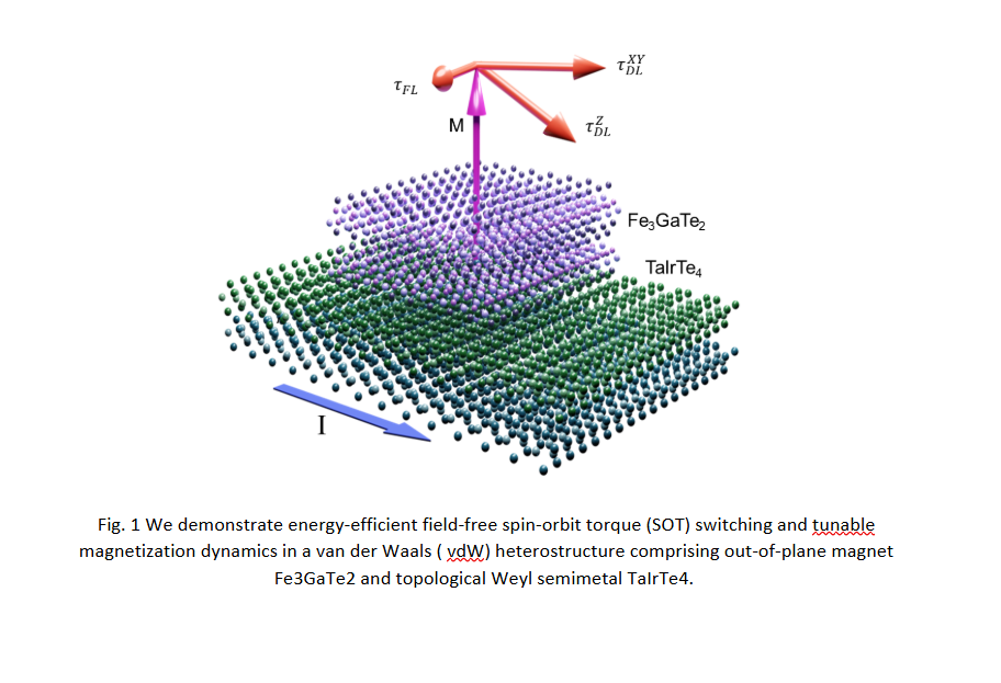 Finally, we built foundational spin-orbit torque memory devices, demonstrating energy-efficient magnetization switching. Combining TaIrTe₄ and Fe₃GaTe2 heterostructures enabled deterministic magnetization switching at room temperature using simple electrical pulse current, without the need for external magnets, thereby advancing efficient memory technology.