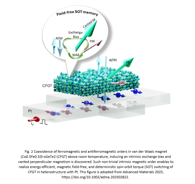 2DFMs, such as cobalt- and nickel-doped Fe₅GeTe2 and Fe₃GaTe2 were grown, showing stable magnetic properties above room temperature, addressing a key challenge in 2D magnetism. Doping tunes Curie temperature and magnetic anisotropy and some compositions show coexistence of ferromagnetic and antiferromagnetic orders above room temperature, creating intrinsic exchange bias and canted perpendicular magnetism. This non-trivial magnetic order enables energy-efficient, magnetic field-free, deterministic spin-orbit torque (SOT) switching.