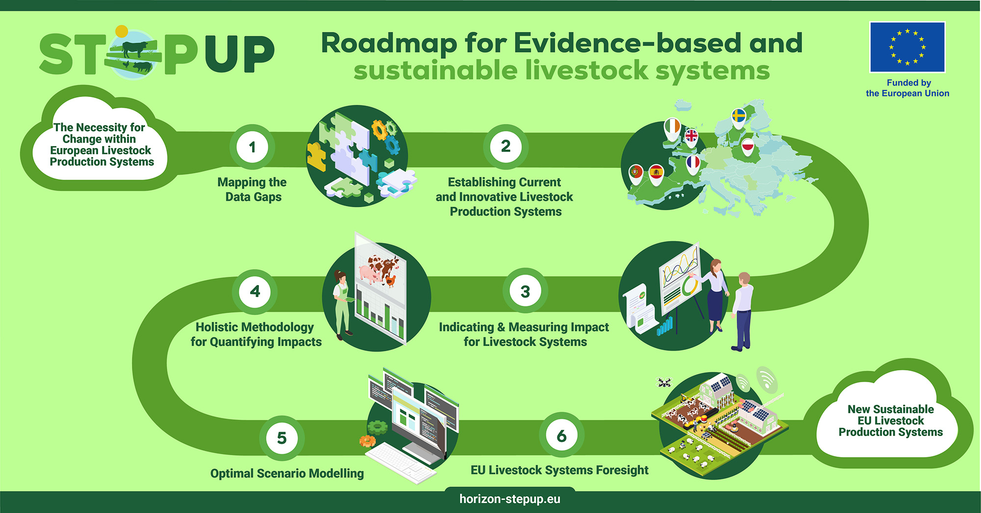 Overall, during the first 18 months of the project, STEP UP has been implemented according to the Description of Action (DoA). Partners have actively been working on developing of one Key Exploitable Result (KER) - STEP UP Sustainability catalogue which will include an overall evidence-based group of key project results. Building on this, six test cases are being carried out to generate results for KERs, focusing on: A) animal health and welfare impacts, B) economic performance and resilience of farms, C) validation of sustainability metrics, D) integration of farm-level and national datasets, E) environmental and climate impacts of livestock systems, and F) supporting policymakers with practical tools for assessing trade-offs and synergies. The STEP UP DEC and multi-actor engagement plan has been successfully implemented. By the time of reporting, the project’s website and communication channels had reached over 15,000 of website visits, newsletters had attracted more than 440 subscribers, and the collective social media presence surpassed 750 followers. STEP UP has already contributed to 15+ public events, produced 3 practice abstracts, and published 3 scientific publications. Finally, the modelling framework, as well as the critical data needs required to simulate future scenario development, has been defined based on three models – CAPRI, AGMEMOD, and MAFSEU. The definition of a safe and just operating space (SJOS) for EU livestock production has been determined, along with a list of dimensions, indicators, and variables to consider in future work on scenario identification and assessing potential conditions for SJOS within the EU livestock sector.