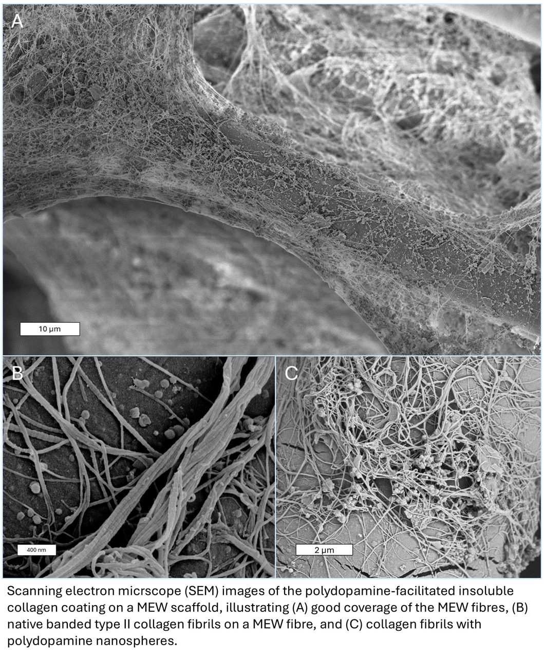 The goal of this WP is to functionalise the surface of MEW scaffolds with solubilised cartilage extracellular matrix (ECM), and to assess how this impacts the capacity of such scaffolds to support chondrogenesis of human marrow stem/stromal cells (MSCs). For surface functionalisation of the MEW scaffolds, existing methods for polydopamine-facilitated collagen coatings were evaluated and compared with a novel method. The loading efficiency of each method was measured, which indicated the novel method led to a higher loading of collagen into the polydopamine coating. This novel method was then employed to investigate the chondrogenic potential of a range of different extracted collagens, with uncoated and polydopamine coated scaffolds serving as controls. Three collagen extractions were employed to coat the scaffolds:
