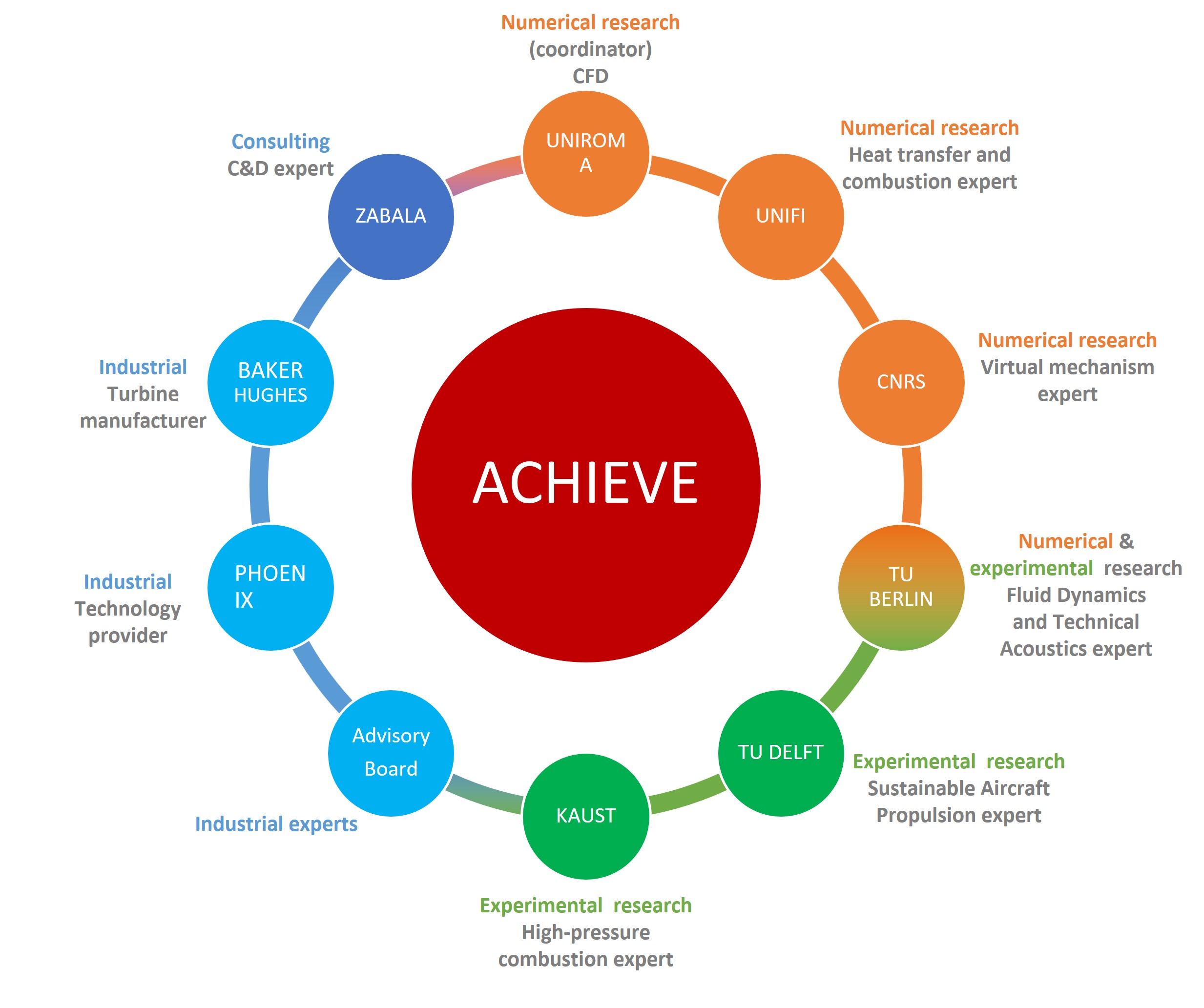 ACHIEVE aims at developing the fundamental knowledge to enable a transition to unconventional carbon-free fuel blends based around H2 and NH3 to achieve zero carbon emissions, ultra-low NOx emissions, and stable gas turbine operation. ACHIEVE proposes a three-pronged strategy consisting of (a) experimental and (b) numerical activities, that will advance the technology readiness level (TRL) up to 4 for practical low emissions combustors for realistic and representative blends of fuels, as well as (c) system level engagement with OEMS, end users, and stakeholders. Experimental campaigns will explore combustor stability limits, emissions, and fundamental aspects of the combustion of hydrogen blends, with the complexity of the experimental burners and operating conditions increasing over time and culminating in tests performed at intermediate pressures and powers relevant for gas turbine conditions. Numerical activities will address combustion modelling challenges, including chemical kinetics, fundamental physics governing flame dynamics, ushering in new modelling techniques such as artificially thickened flames coupled with virtual chemistry, sub-grid LES models for thermo-diffusive instabilities and stability analysis aimed to understand and predict NOx formation mechanism, lean blow off, flashback limits and thermoacoustic instabilities. Real-time monitoring and predictive capabilities for practical combustion systems will also be developed. Finally, in the third prong, engagement with industry, OEMs, and other target groups will leverage the results of ACHIEVE with the necessary stakeholders to progress the transition to a carbon-free fuels for power generation.