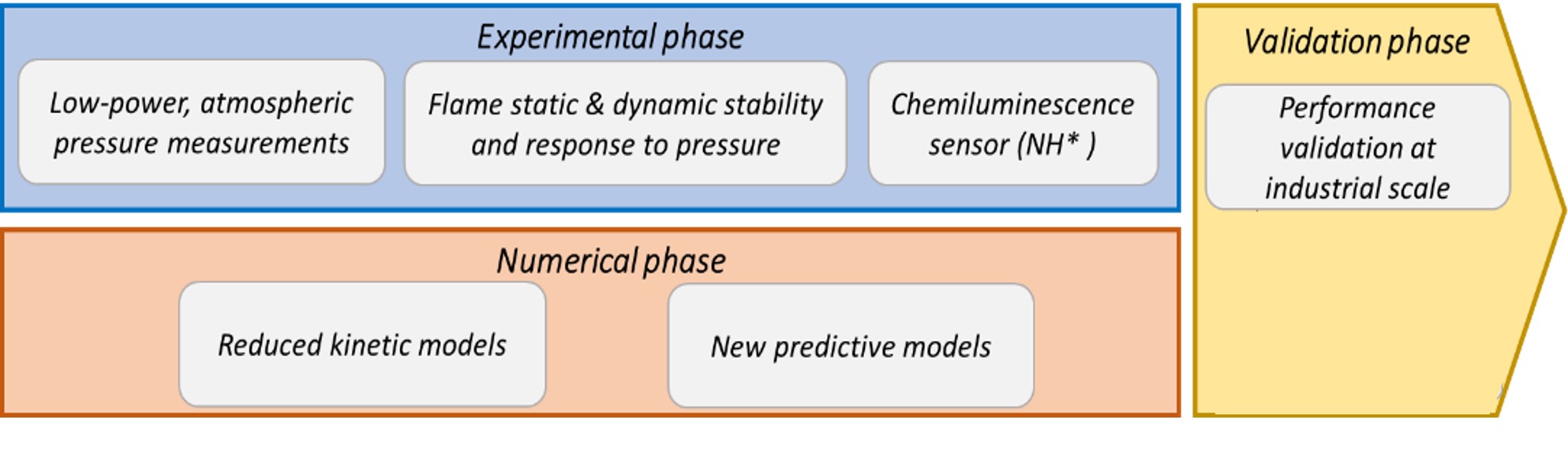Laboratory-scale tests were carried out in multiple facilities across the consortium to characterise the behaviour of unconventional hydrogen blends. Dedicated burner rigs were upgraded or developed and, in this initial phase, operated at atmospheric pressure, providing preliminary key insights into lean blow-off, flashback resistance, NOx emissions, and dynamic flame response. In particular, a set of canonical burners were operated under varying conditions and supported by high-speed imaging and chemiluminescence diagnostics, producing detailed datasets that are now being used for model validation. Complementary campaigns were performed on a more complex dual-swirl burner geometry, also focusing on flashback and lean blow-off limits, while extensive work was dedicated to the adaptation of the experimental rig for future safe handling of ammonia. Work is also underway on a medium pressure test rig to reach full operational capability and start thermoacoustic analysis.