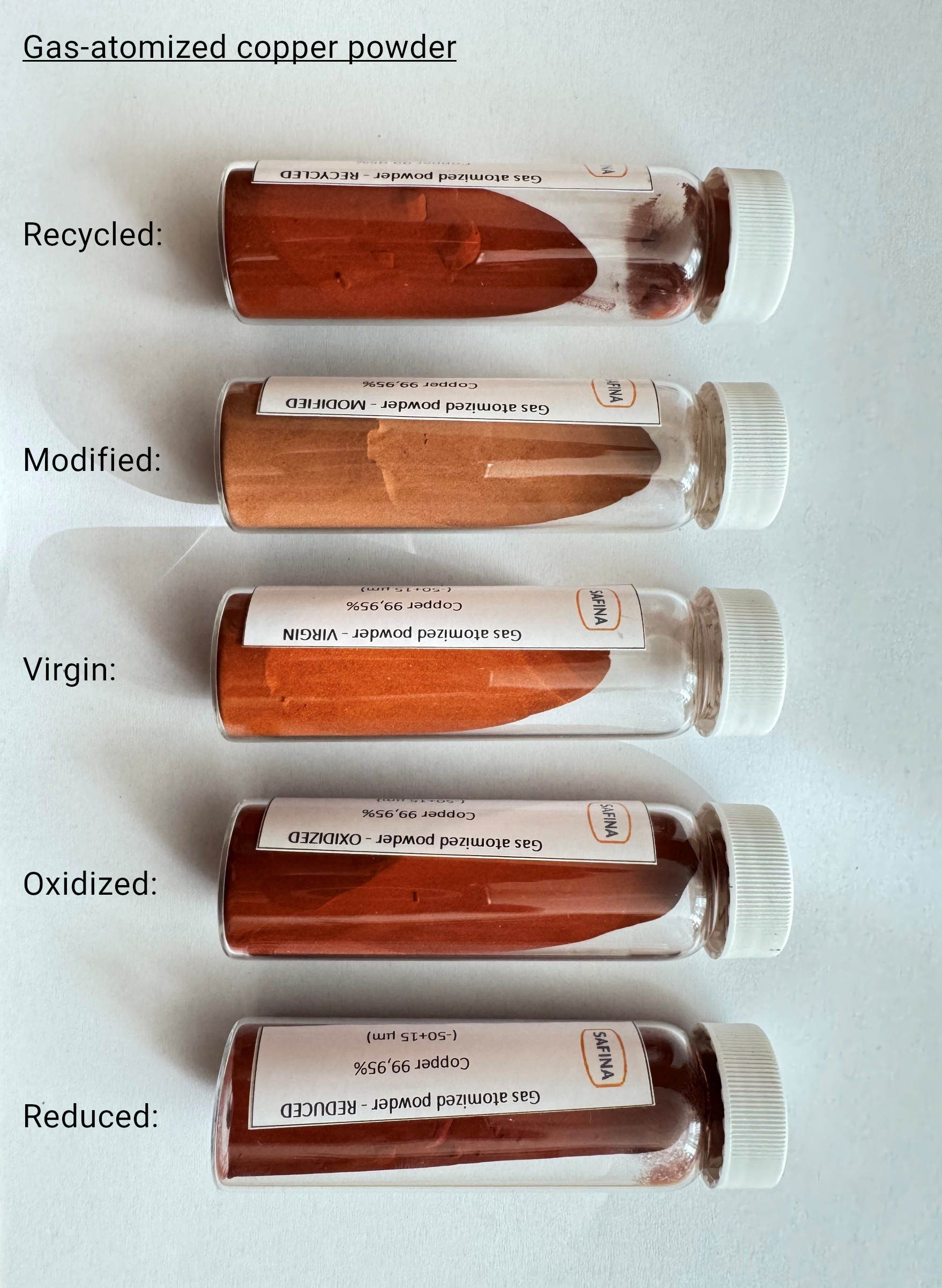 On the material side, a robust process to regenerate oxidised Cu powder was developed. It reduces the oxygen content of used powder by reduction in H2-atmosphere without impacting flowability or process parameters. Preliminary tests with recycled powder showed a comparable dependence of porosity and surface roughness on laser power and scan speed as virgin powder. Also, the effects of surface modification by etching were evaluated. However, absorption improved little, and the process window remained limited. Efforts to produce test samples of metal matrix composites from SiC and Cu failed, though, due to the large density differences and a lack of adequate homogenization.