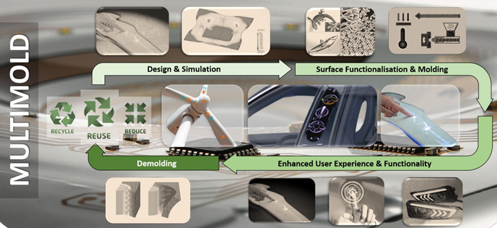Film insert molding and in-mold decoration are standard processes in injection molding allowing to generate 3D-shaped objects with seamlessly integrated graphics and high freedom in design. With the functional printing of electronic circuits and sensors, the field of in-mold electronics (IME) has now emerged. This technology embeds lighting and capacitive sensors for human interaction in injection molded products, thus allowing to prepare 3D-shaped human machine interfaces (HMIs) with a smooth surface and an appealing design. The interest in HMIs based on in-mold electronics technology has been taken up especially by the automotive industry and in control panels for consumer products. In the past the different functions in HMIs (shape, light, electronics, haptic sensation) were realized by assembling different components separately. By integrating the electronics in the IME process these functions are integrated in one plastic product in a single injection molding process. Thus, the entire complexity of the product manifests in the increasingly complex mold fabrication and injection molding process, finally resulting in a simple-to-use multifunctional product. Despite these decisive advantages, the market uptake is currently hindered by several limitations of the technology. The goal of MULTIMOLD is thus to overcome the current challenges of IME products which are: 1) the overall manufacturing process in IME typically involves multiple sub-processes like printing, component assembly, lamination, forming and injection molding. Although most of the sub-process yields are around 99%, the combination of many sub-processes currently results in a high drop-out rate. 2) the IME product becomes a multi-material compound that is difficult to recycle and thus does not meet the requirements of European society and policy on sustainability and circularity. 3) the embedding of complex electronics (microcontrollers, ICs) requires multilayer PCBs with high resolution interconnection lines and contact pads not easily achieved with functional printing used in IME so far. 4) the currently used capacitive sensors are not usable with cold fingers or gloves and do not provide haptic feedback, thus leading to an unsatisfactory user experience. 5) the direct lighting by LEDs placed in the vicinity of capacitive sensors generates a substantial heat inside the injection-molded part, leading to bad user experience in the HMI. In addition, low durability due to cracked interconnection lines often occurs next to the rigid LED parts, in particular in 3D-formed areas. 6) the humidity resilient integration of sensors and electrical components has not yet been established in IME processes. By introducing the next generation manufacturing process of products with complex geometries and microstructures based on in-mold electronics establishing a robust, weather-resistant material concept that provides inherent recyclability by design. Piezoelectric sensing, improved light management and high integration density open up innovative solutions for the targeting industries (i.e. technology and tools manufacturers, integrators, OEM, and end users) in the automotive HMI (market size USD 23 billion in 2023), industrial HMI (market size USD 5.3 billion in 2023) and Condition Monitoring (market size USD 3.1 billion in 2024) sectors. The innovations (i.e. simulations, skills development strategies and LCA / recycling results) developed in MULTIMOLD are also expected to have impact on the scientific community and on the environment.