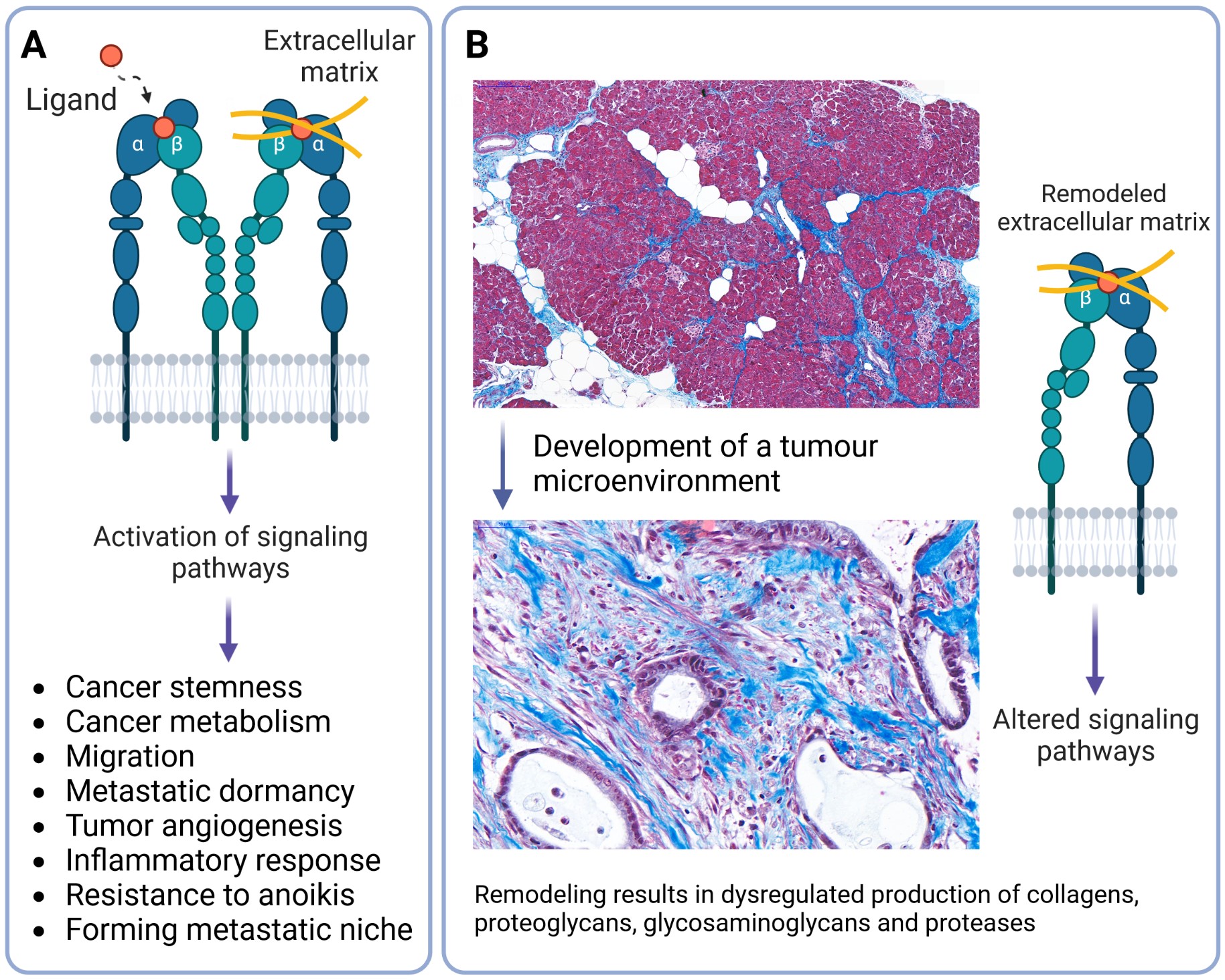 The problem: The extracellular matrix of pancreatic cancer is very complex and consists of many fibrotic proteins, including collagens, proteoglycans, laminins and fibronectin. In tumour tissues, the remodelling of the matrix induces the growth of cancer cells, which in turn interact with the matrix through integrins, a major class of cell surface and adhesion receptors. Integrins facilitate cell-cell and cell-matrix interactions in the tumour microenvironment and guide signalling pathways, leading to disease progression and metastasis. Thus, integrins have become an important target for anti-cancer therapeutics, which are tested in clinical trials. Despite the critical role of the adhesion requirements in guiding cell behaviour, a robust engineering approach to mimic the specific adhesion profile of cancer cells and instruct the disease-relevant integrin profile in experimental models is missing.