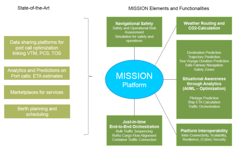 MISSION develops an interoperable digital, real-time decision support tool enabling communication and coordinated port call operations, for streamlining logistics, enhancing safety, and reducing noxious emissions and greenhouse gases. This enables ships to get just-in-time (JIT) at the port area and allows them to proceed directly to their berth without waiting. Stakeholders benefit from increased transparency and information sharing that enable them to optimize their resources, including port hinterland modalities in compliance with the Maritime Labor Convention. Communicating terminal or port readiness earlier to vessels allows ships to adjust speed and save fuel of up to 21% of the overall voyage. Especially high fuel savings can be achieved through JIT strategy and slow steaming in bulk and container shipping. While RoRo-vessels normally operate at pre-defined routes and on fixed schedules, they benefit from less traffic-condensed port entries and seaways as well as transparent real-time communication of readiness levels regarding ports and terminals. The MISSION project is aligned and directly contributes to different European initiatives, including The European Green Deal, The Sustainable and Smart Mobility Strategy, and The Zero Emission Waterborne Partnership.