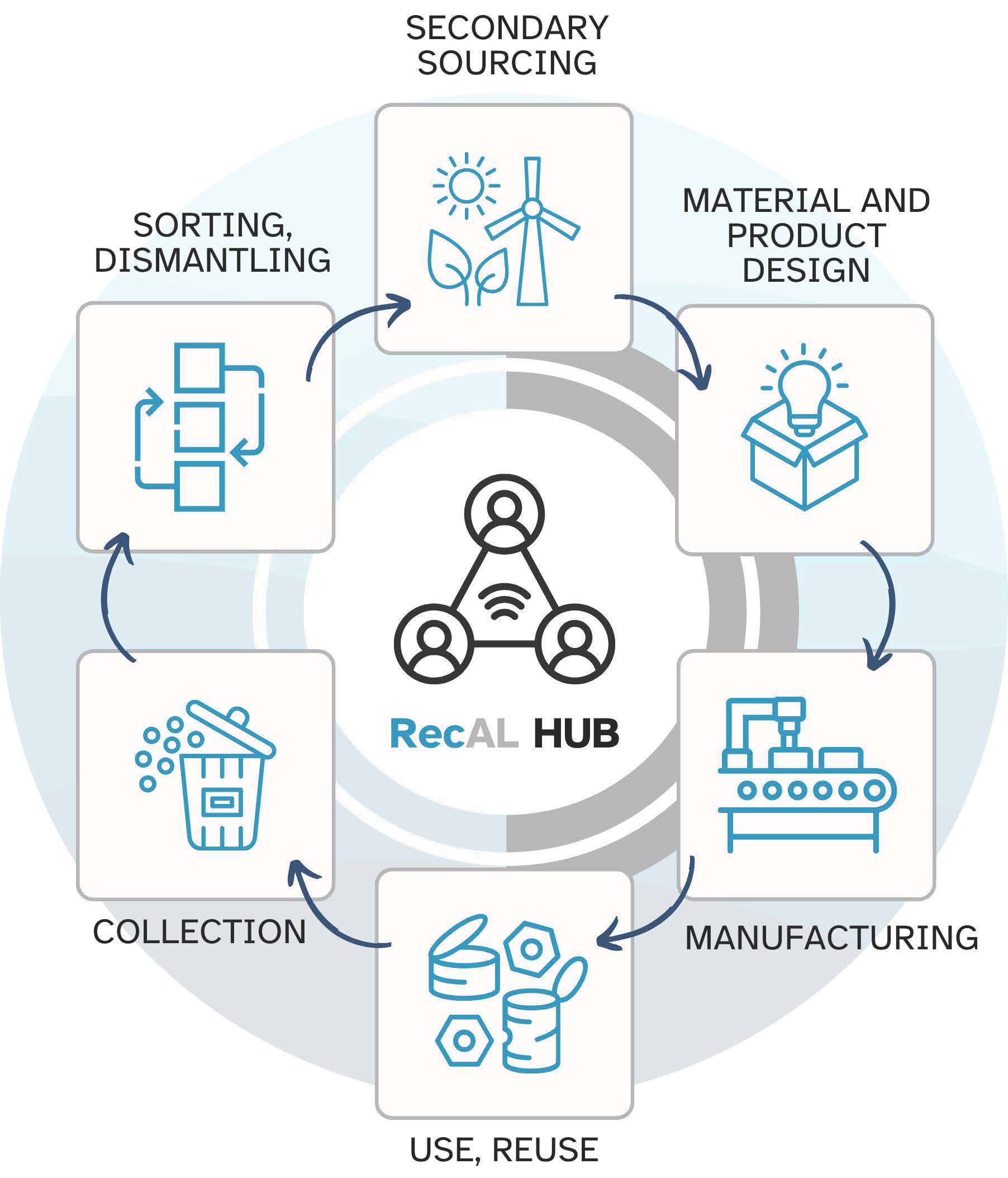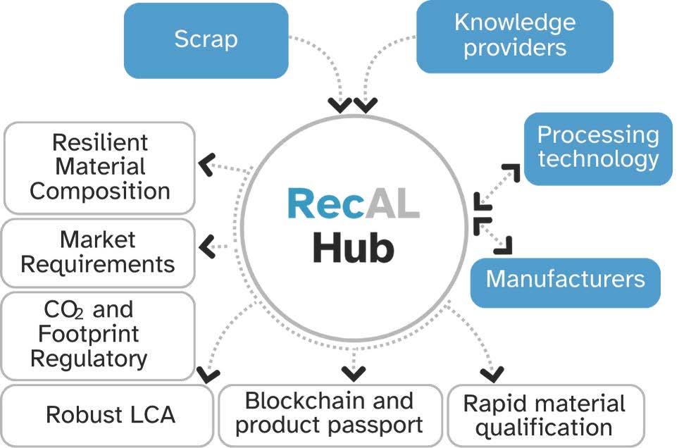 RecAL CATs are innovative recycling technologies that will be developed from TRL4-5 to min. TRL 6 throughout the project. Thay target a variety of goals along the entire value chain, such as improvements to the capture, separation, and circular reuse of aluminium recyclates and development of sustainable, recycling friendly alloys. Ultimately, the RecAL Circularity HUB will be demonstrated via three use-cases, that resemble and quantify the impact on future closed value loops from Aluminium EoL-procurement to remanufacturing.