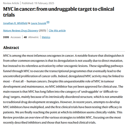 A critical cancer driver is MYC, a non-redundant transcription factor essential for cancer cell proliferation and survival. MYC dysregulation (~70% of cancers) is associated with poor prognosis and resistance to therapy. Despite the high interest in developing a clinical MYC inhibitor, none is currently available. MYC's classification as undruggable stems from its lack of a well-defined structure and nuclear localization, which together challenge the most cutting-edge medicinal chemistry tools.