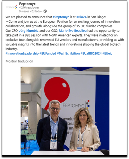 If the results of this project are positive as expected, Peptomyc could close a licensing agreement by 2026, bringing Peptomyc to revenue-stage and allowing reinvestment in our pipeline assets at discovery stage. Beyond this economic impact, MYCureX has social impact at both the EU and global levels, by addressing the broad cancer challenge, and will contribute to position Peptomyc and EU’s leadership in healthcare, by enabling targeting notoriously undruggable and clinically valuable targets, becoming a symbol of successful innovation.