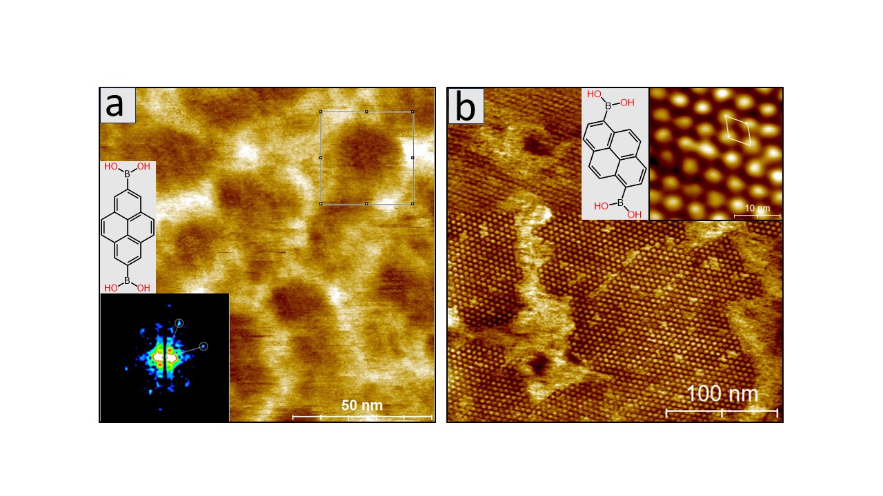 We are studying how tiny molecules join together directly on a surface to form sheets just a single layer thick, called two-dimensional polymers (2DPs) or 2D covalent organic frameworks (2D-COFs). Instead of making these materials separately and analysing them later, we watch them grow in real-time, in the liquid-solid interface where they are actually formed. This is a big leap forward compared to traditional material synthetic methods, which build the material first and examine its properties afterwards. To do this, we use a cutting-edge tool called high-speed atomic force microscopy (HS-AFM), which can record images at 45 frames per second, almost like filming a molecular movie. With this speed, we can track molecules, one by one, as they move, meet, and lock together into larger networks. By understanding how the molecules choose their pathways during polymerisation, we can control the process to create much larger, more perfect sheets with fewer defects. But, why does this matter? Just like a cracked windshield weakens a car, defects in a material weaken its performance. In advanced electronics and semiconductor devices, the tiniest imperfection can ruin performance. If we learn how to guide molecules into defect-free patterns, we can build stronger, more predictable materials for future nano-electronics.