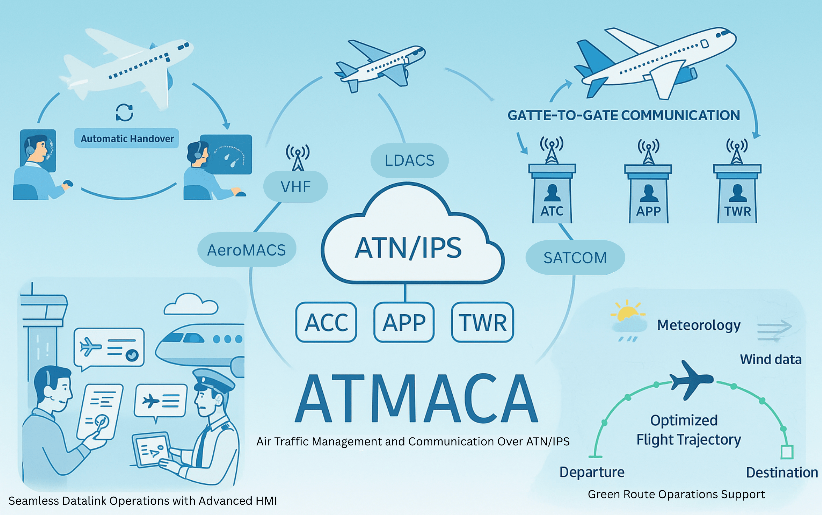The ATMACA project proposes a comprehensive ATM and communication solution for the ATN/IPS environment, supporting the transition from legacy systems to a modern, flexible, and reliable digital infrastructure. ATMACA will be deployed across air traffic control sectors and aircraft domains to enable resilient, efficient, and interoperable air-ground communication services.