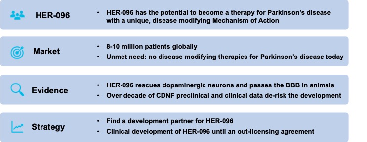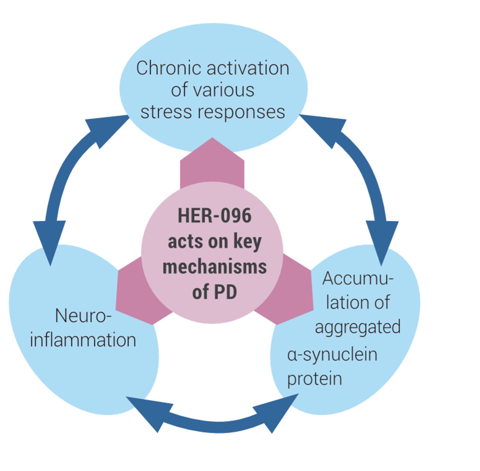 Herantis has developed HER-096 for stopping the progression of PD. HER-096 is a peptidomimetic which reduces cellular stress, prevents formation of pathological protein aggregates, and alleviates neuroinflammation thereby modifying disease progression. HER-096 combines this compelling mechanism of action with the ability to penetrate to the brain after patient friendly subcutaneous injection. Thus, HER-096 is on its way to become a first-in-class disease-modifying drug to slow or even stop the progression of PD.