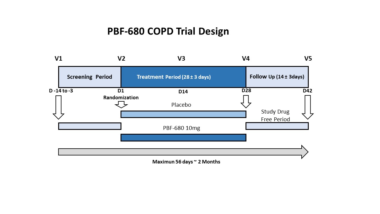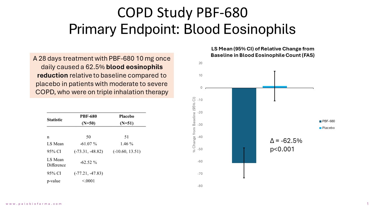The trial demonstrated that a 28-day treatment with PBF-680 significantly reduced blood eosinophil count in patients with moderate to severe COPD on triple therapy (Standard of care) compared to placebo. Given that high blood eosinophil levels in patients correlate with COPD exacerbations, PBF-680 has the potential to become the first oral disease-modifying therapy for COPD patients.