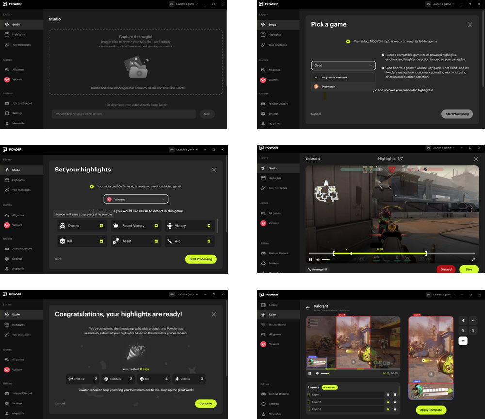 Powder for Creators: Built from +1800 creators' surveyed, automating highlight extraction, montage creation, and optimizing social media posts. Reducing the 5 hours 17 minutes typically spent on editing per stream.