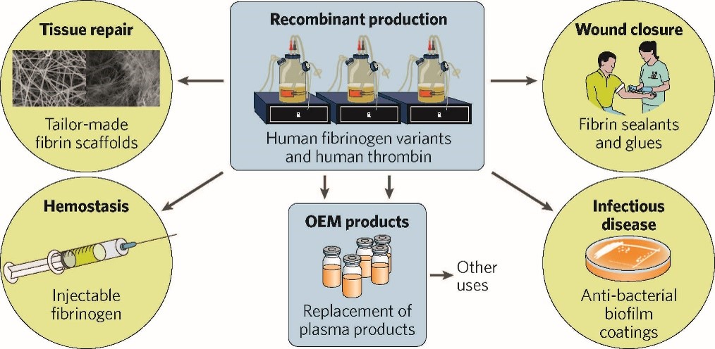 • Recombinant production creates the opportunity to produce individual fibrinogen variants with unique functional properties. This enables customization and improvement of heamostasis products by using fibrinogen variants with optimal clotting properties and creates the opportunity to develop products outside the traditional haemostasis and wound closure field.