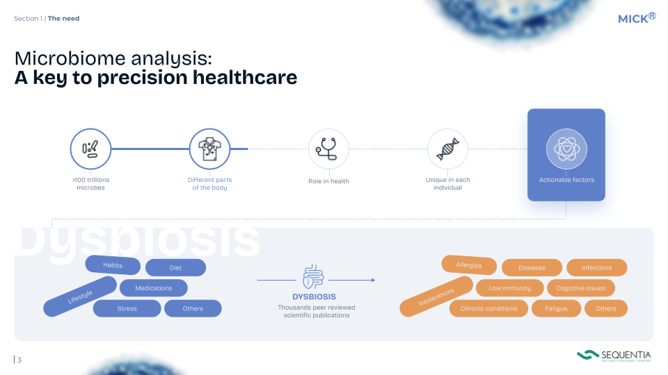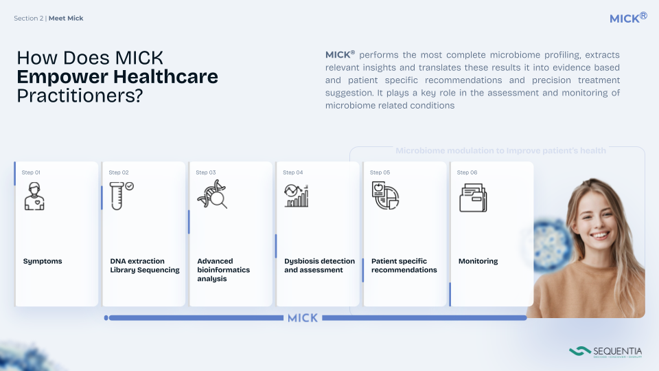 Our project addresses this challenge through MICK©, a pioneering microbiome analysis platform designed to make scientifically backed microbiome testing widely accessible to healthcare professionals.