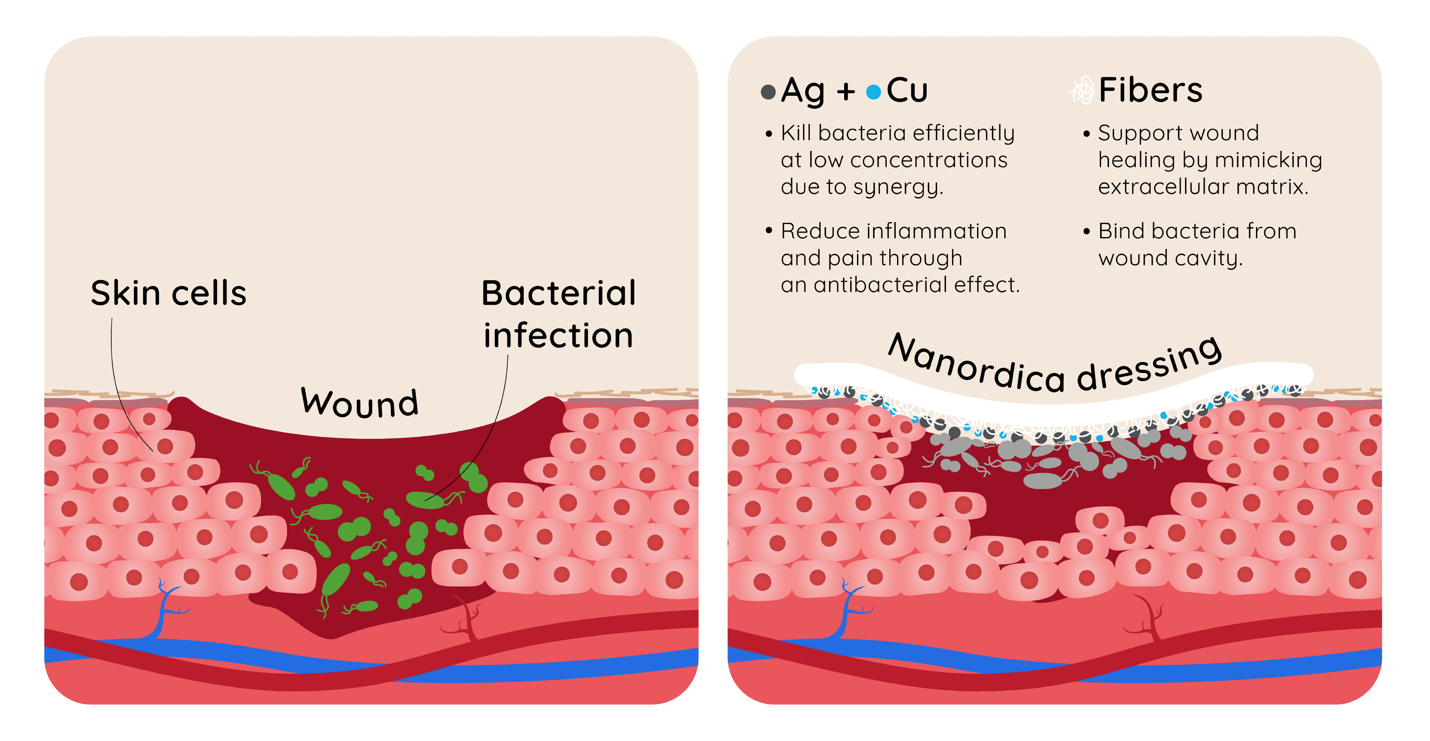 We are the only company in the world developing first-in-class wound care products based on synergistic nanoparticles that manage bioburden and support wound healing. Our first product, Antibacterial Wound Dressing (AWD), removes bacterial infection 8x better and heals diabetic foot ulcers 2 times faster than the current best.
