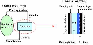 The development of the battery was split into separate work packages covering the zinc half cell, the air electrode, unit cell development and engineering of a pilot scale flow battery system.