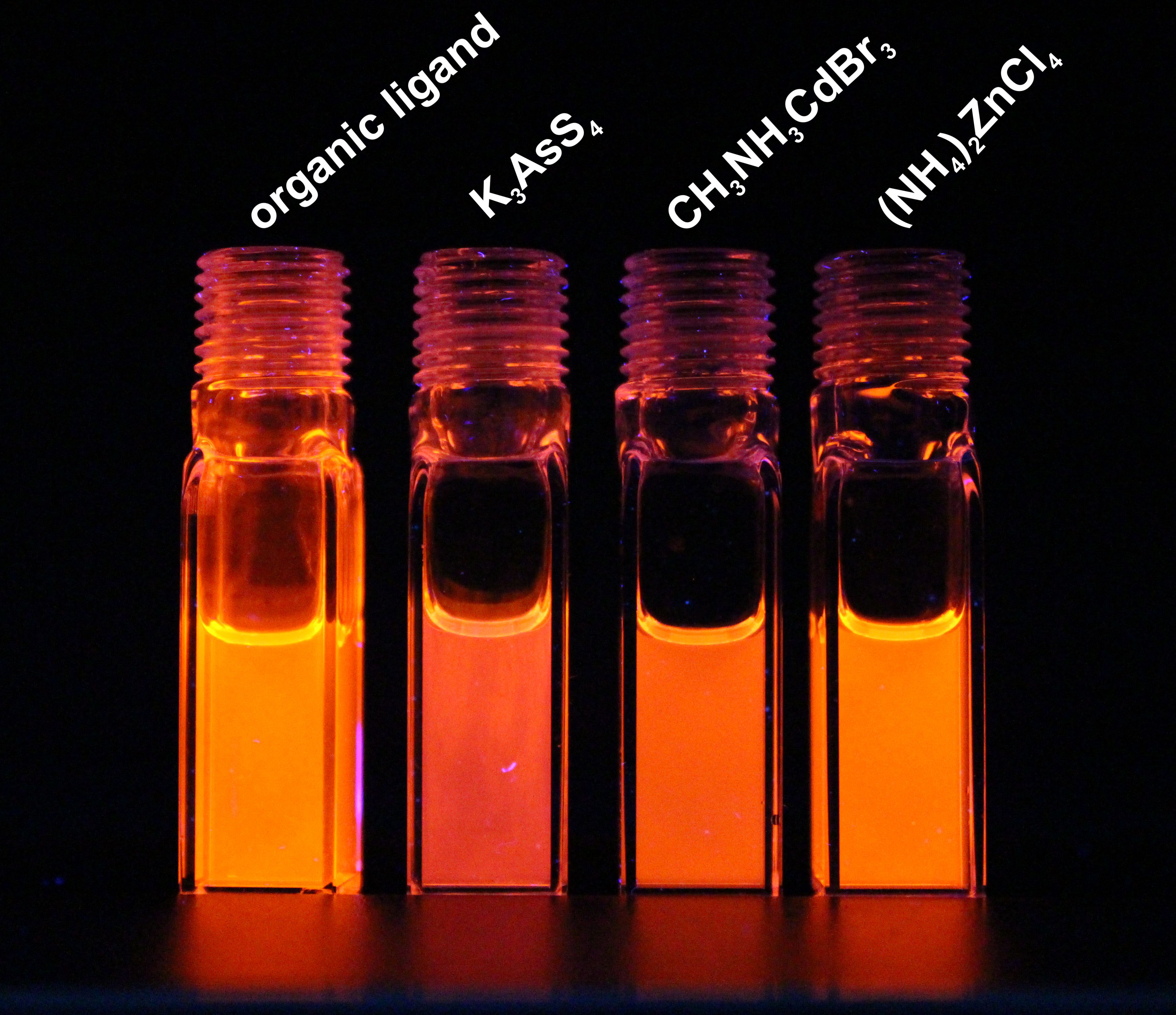 - achievement of the first inorganically-capped colloidal NCs with PL QE comparable to that of organically-capped NCs, namely: 20−30% for near-infrared emitting CH3NH3PbI3-capped PbS NCs and 50−65% for red-emitting CH3NH3CdBr3- and (NH4)2ZnCl4-capped CdSe/CdS nanocrystals