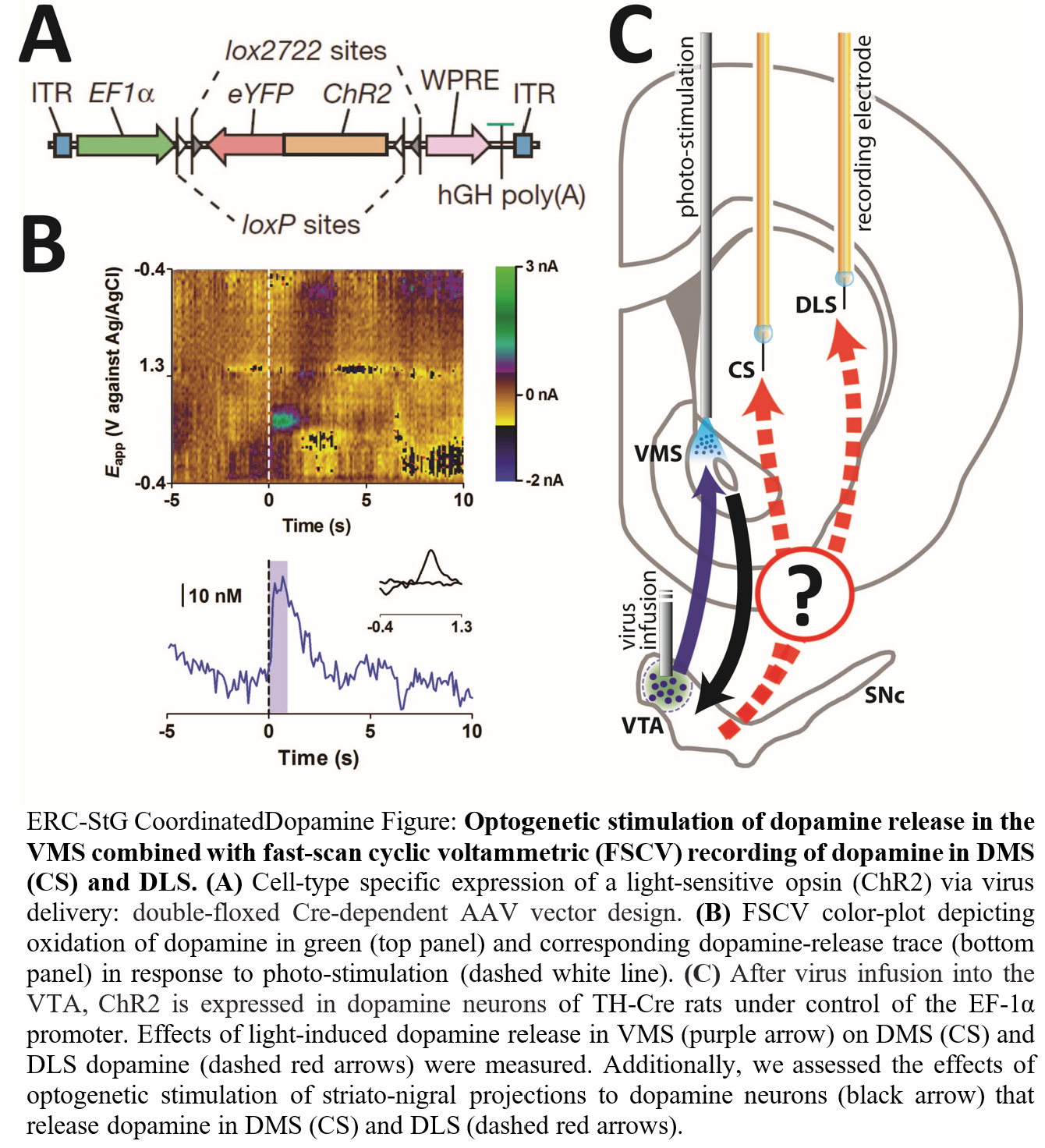 We combined optogenetic stimulation of dopamine release with detection of dopamine release using FSCV to conduct brain-circuit mapping experiments in vivo. Specifically, we used optogenetic stimulation of different inputs to dopamine neurons projecting to associative and sensorimotor striatum, respectively, to test the functional existence of presumed striato-nigral pathways for hierarchical region-specific dopaminergic control in the basal ganglia and also to identify the most effective inputs.