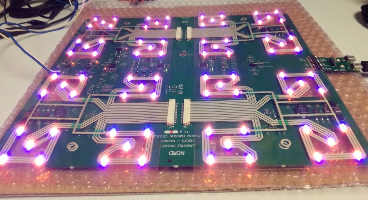 The electronic "smart" core of the LUMENTILE includes large-area electronic circuits and high brightness discrete LEDs, of red, green and blue color, that are capable of generating any possible color. The electronic layer also includes the sensors fro detecting people walking onto the tiles (for floor applications) and detecting users' gesture (for wall tiles).