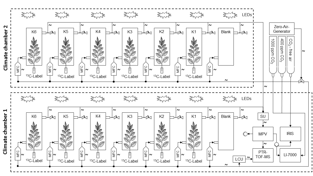 The overall goal of VOCO is to shed new light into regulatory responses of plants and ecosystems to global climate change, bridging scales from sub-molecular to ecosystem processes. VOCO aims to develop a novel technological and theoretical basis for carbon partitioning breaking new ground by innovative isotope labelling to establish mechanistic descriptions of plant primary and secondary metabolism, namely CO2 and VOC emissions. VOCO explores the role of climate change stresses on these processes in different plant functional groups to foster our understanding of vegetation response to climate extremes.