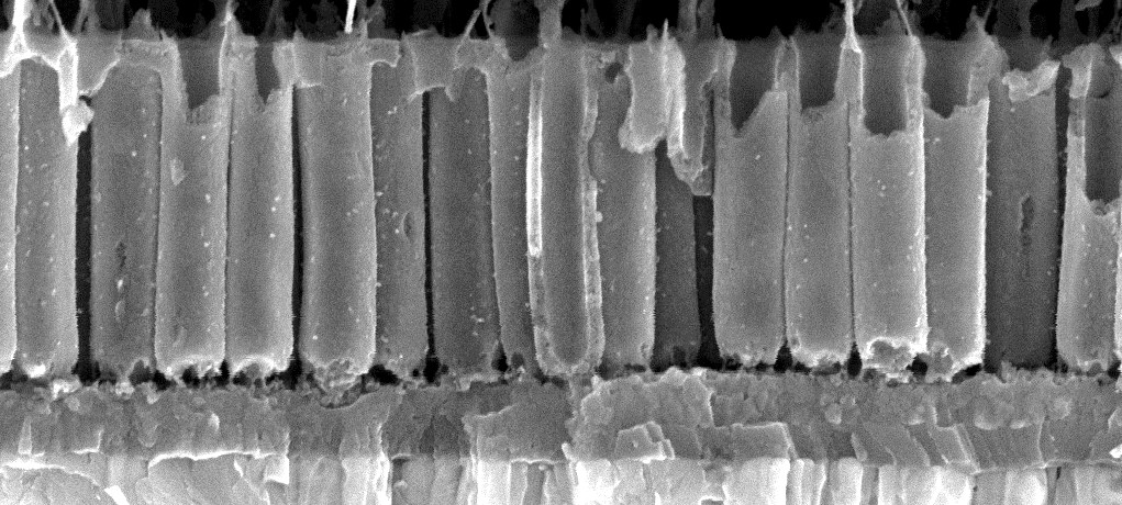 One piece of work has focused on the nanoporous matrices to be used as templates for the cylinders. We use "anodization", an electrochemical procedure used industrially for the surface treatment of some metals. In SOLACYLIN, we have explored simple methods for generating anodized arrays of pores that display a high degree of order and a homogeneous geometry from the very beginning. This contrasts with existing methods, in which either the pores start out disordered and only become ordered later, or expensive manufacturing techniques (lithography) are used to define the order preliminarily. In particular, we have established how to generate arrays of short (0.1 to 3 µm) pores directly on a transparent conductive substrate in a manner such that the materials deposited inside them are in direct electrical contact to the underlying substrate.