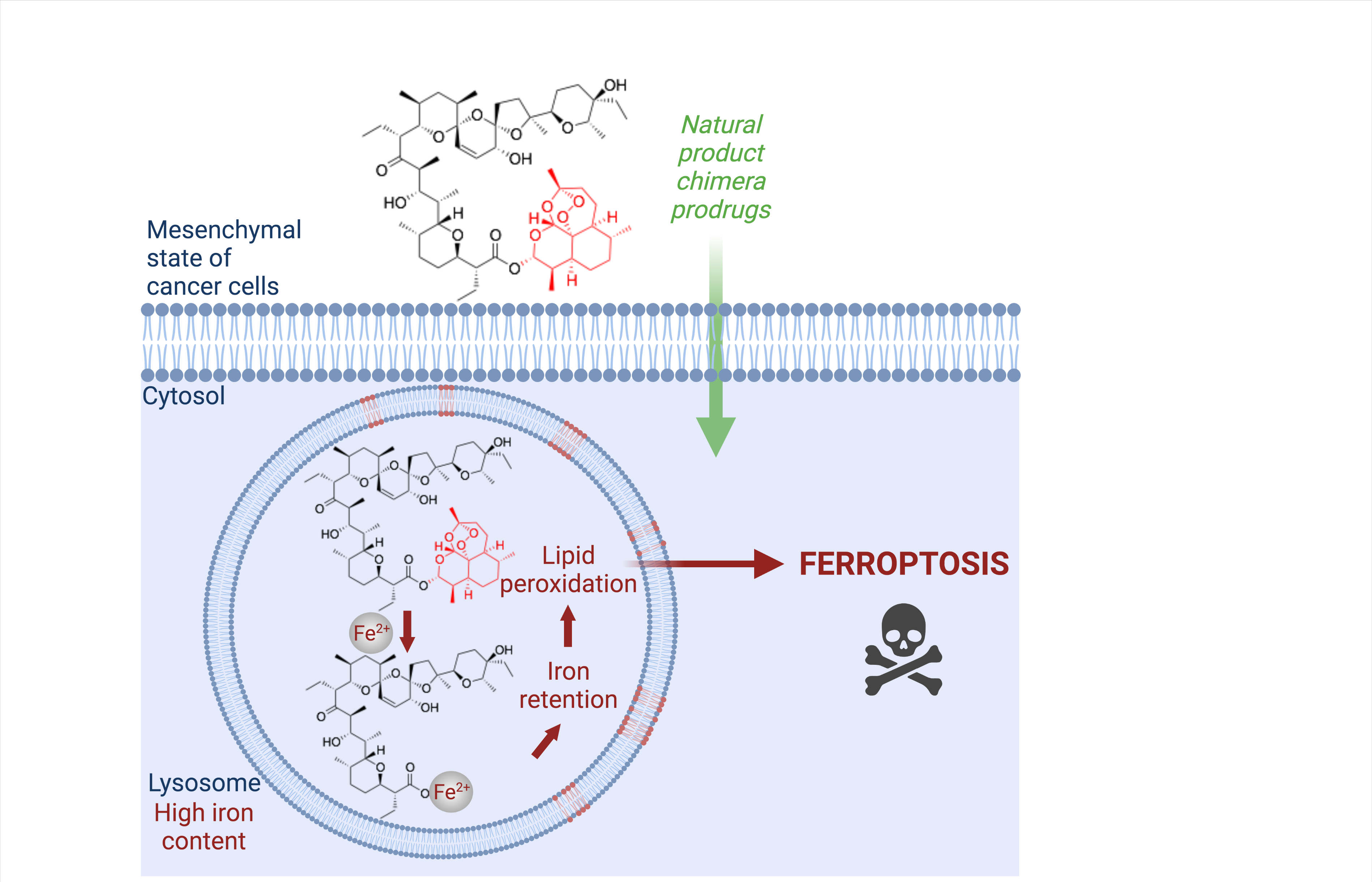 Using click chemistry, we have discovered that our natural product surrogate we named Ironomycin, targets and sequesters iron(II) in the lysosomal compartment of cancer stem cells. We have discovered that cancer stem cells up-regulate iron homeostasis (1 publication in Nat Chem). These unprecedented findings provide additional basis for personalized medicine using iron as a marker of relapse or using iron depletion to sensitize cancer cells to other genotoxic agents. This work is currently being pursued in our laboratory.