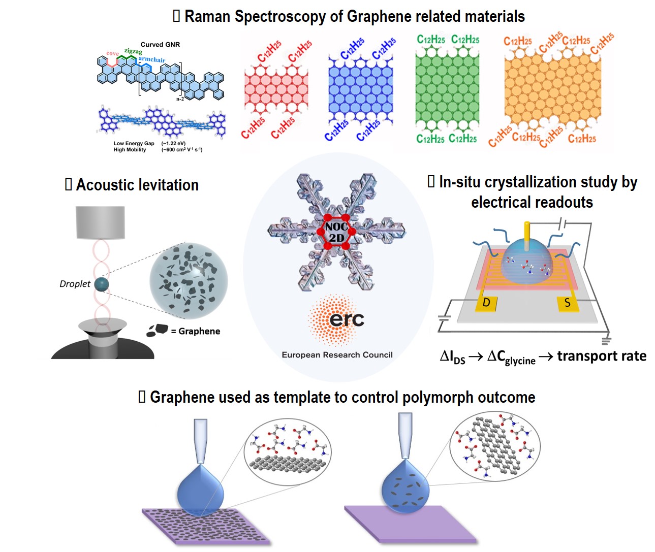 -heterogeneous nucleation was performed using graphene as impurity or surface. We show that graphene induces the preferential crystallization of the metastable α-polymorph compared to the unstable β-form at the contact region of an evaporating droplet. Computer modeling indicates the presence of a small amount of oxidized moieties on graphene to be responsible for the increased stabilization of the α-form. Our results show that the ability to finely tune the surface properties of graphene makes this material very attractive for polymorph screening. This work was published in ACS Nano 2020, 14, 8, 10394 and presented at Chem2D Mat conference in Dresden in 2019 and at the workshop: from 2Dto3D in 2021, Free University of Brussels.