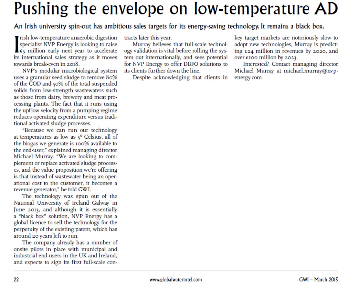 It is also worthwhile noting that during the course of this Phase 1 SME funding that NVP Energy presented the novel Lt-AD technology at the 4th Annual World Water-Tech Investment Summit in London, from March 9th – 11th 2015. The sponsors and partners of the event included Enterprise Ireland, NuWater, and British Water. The benefits of the novel technology for the treatment of low strength WW was very well received by key water treatment industrial figures. Following this trade-show, an article on the benefits of the NVP Energy technology was published in Global Water Intelligence, March 2015 issue (Figure 1).