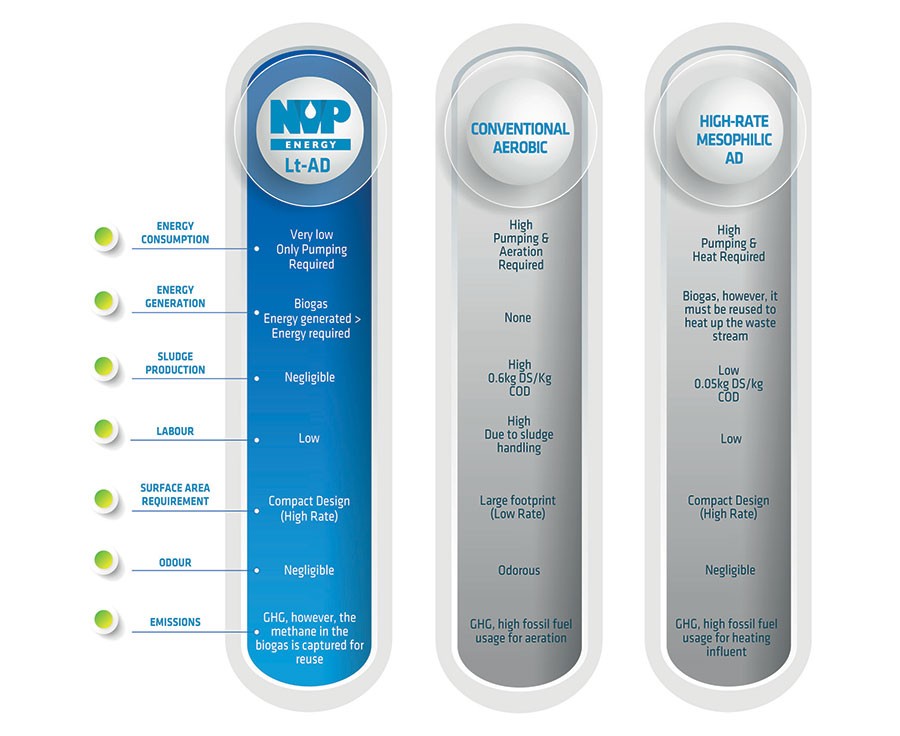 3. A clear value proposition for a typical dairy processing client – attractive payback for end-users has been presented due to low NVP Energy Lt-AD OPEX, and the advantage of using 100% of the biogas produced to offset natural gas usage as well as to acquire renewable heat incentives for the company. The ability to reduce organic sludge by >90% is also a significant benefit to end-users which significantly reduced sludge treatment and disposal costs.