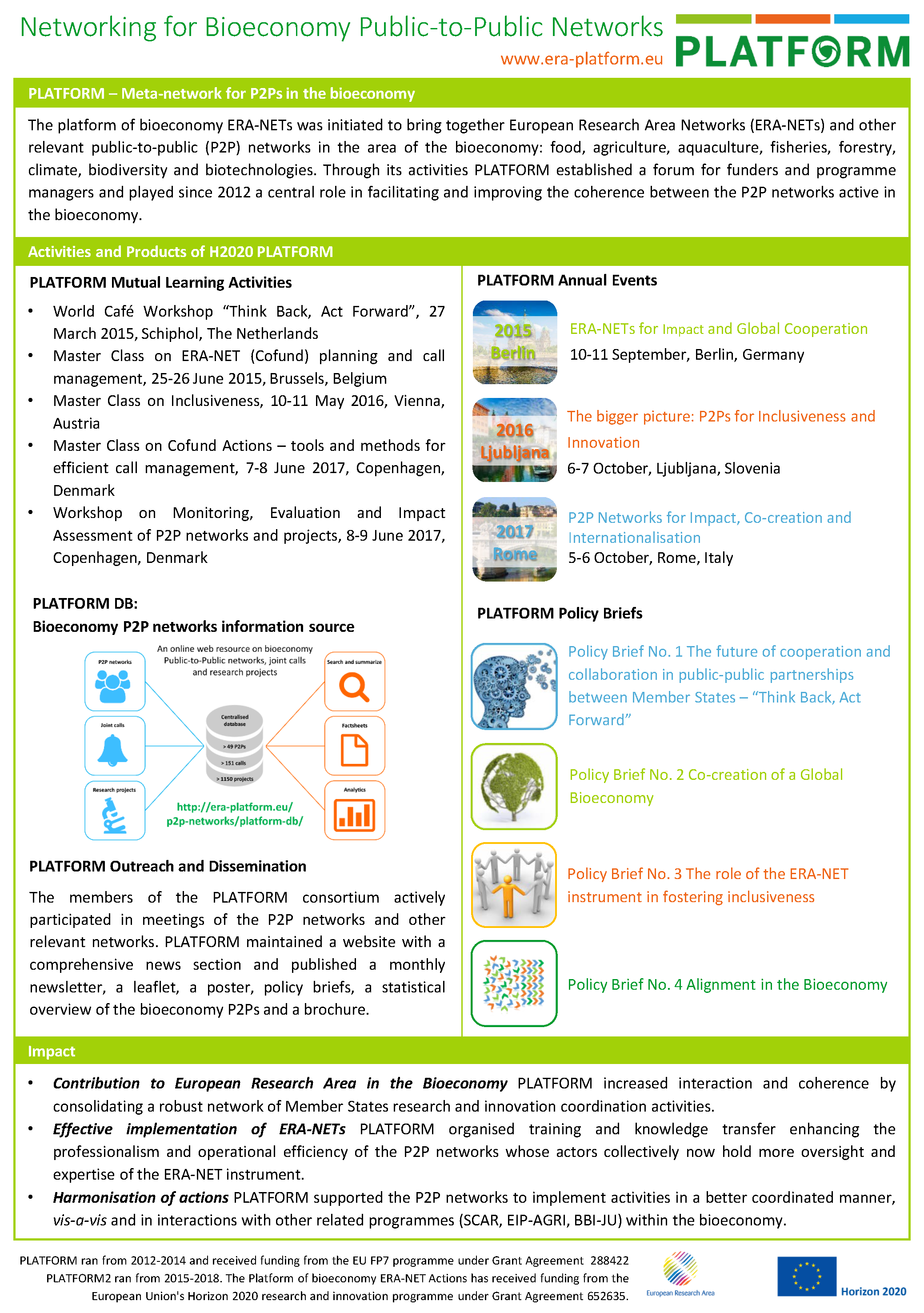 FP7 PLATFORM organised inspiring annual events, dedicated workshops, a master class for call managers, fruitful two-way interactions with the EC, the EIP-AGRI and with the BBI-JU. Surveys, analysis and events also engaged ERA-NETs from neighbouring themes with bioeconomy relevance and other P2Ps. As one result of this broad network is the published book on bioeconomy ERA-NETs and their activities giving a comprehensive overview of all joint calls incl. data on the funded research projects.