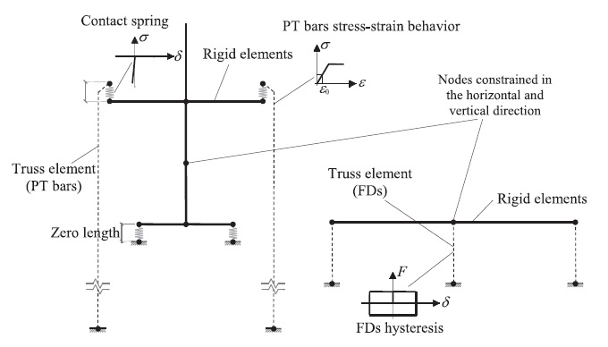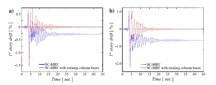 Analytical equations that describe the monotonic and cyclic moment–rotation hysteretic curves of the column base have been defined. The analytical equations consider different limit states including yielding or loss of post-tensioning in the PT bars. The column base is designed with the aid of an optimum graphical design procedure, which ensures damage-free behaviour, self-centering capability, and adequate energy dissipation capacity. Analytical moment–rotation equations and the design procedure are validated with nonlinear FE simulations in ABAQUS. Nonlinear dynamic analyses on steel SC-MRFs have been performed in OpenSees by using a simplified model of the rocking column base. The results show that the rocking column base fully protects the first story columns from yielding and eliminates the first story residual drift.