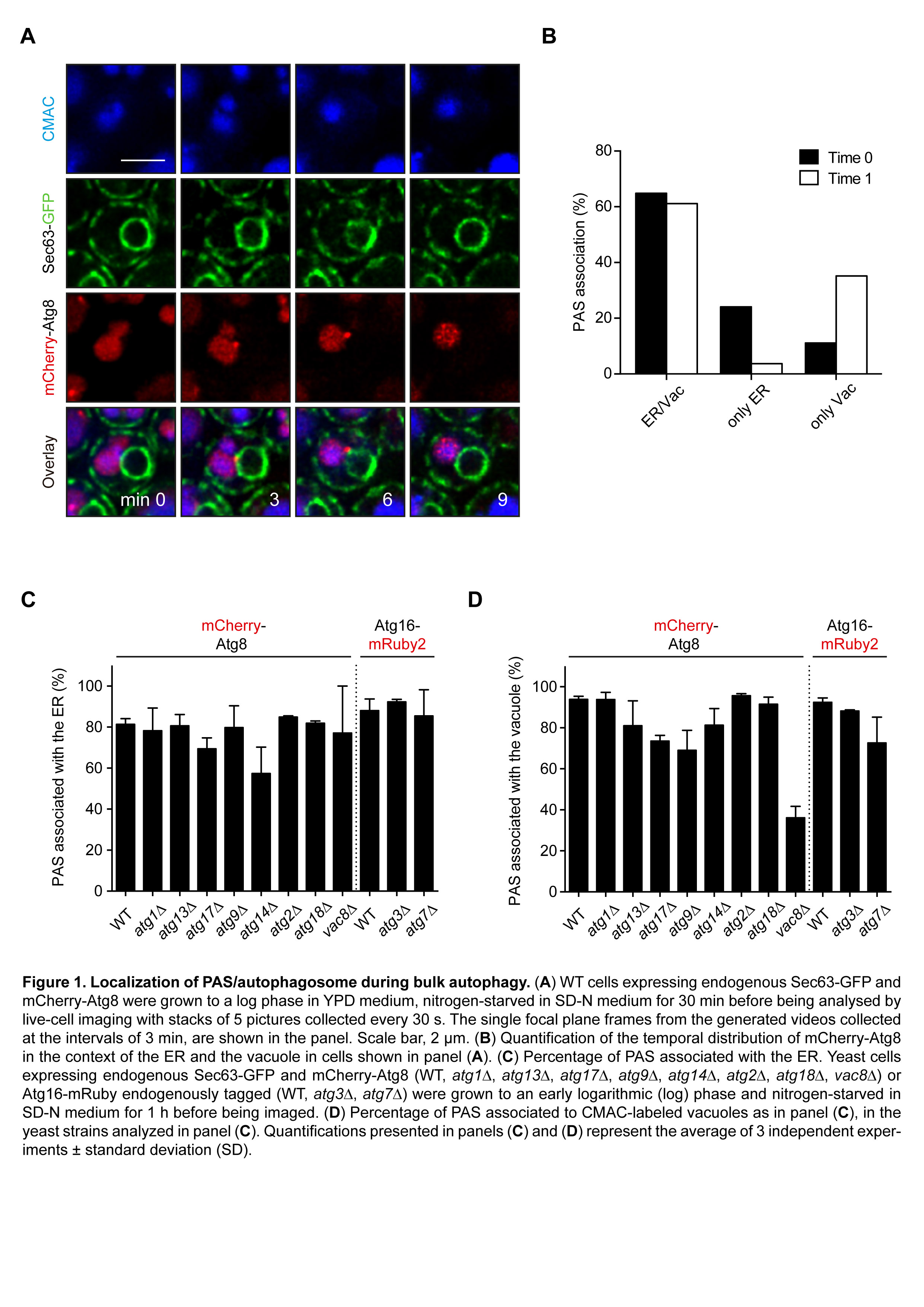 I first set out to characterize the dynamics of the PAS association to the ER and vacuole. The observations suggest that the dynamic direction of the autophagosome formation could occur, at least in part, from the ER network towards the vacuole. These observations are in agreement with previous reports that indicate the formation of new autophagosomes occurs in the proximity of the ER in yeast.