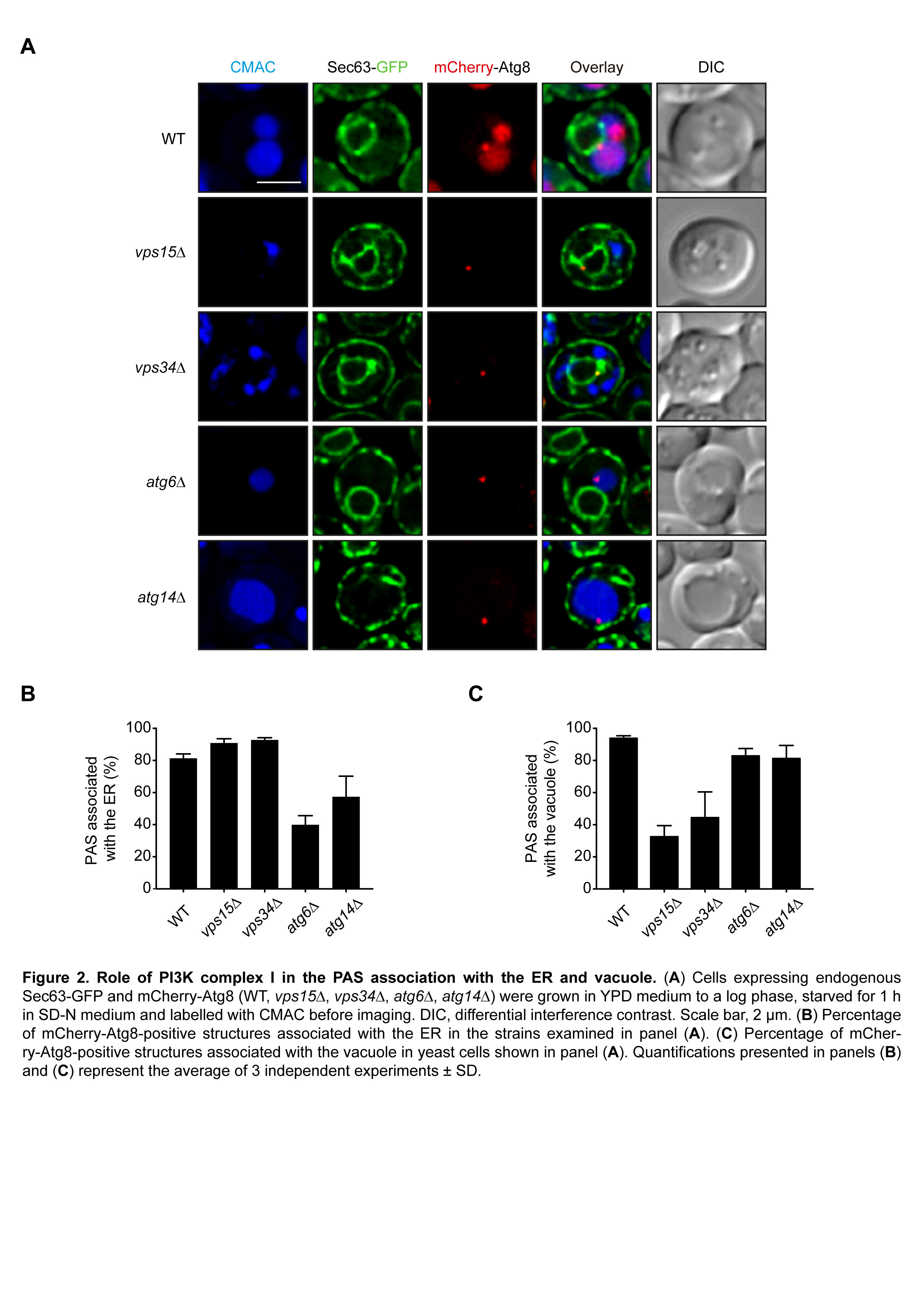 In order to understand better the role of the PI3K complex I, I characterized the positioning of the PAS in cells knocked out for the other components of this complex. That is, the PI3K complex I has a dual role in the positioning the PAS between the ER and vacuole, being the Atg6-Atg14 subcomplex required for its association with the ER and the Vps15-Vps34 subcomplex responsible of its localization adjacently to the vacuole.