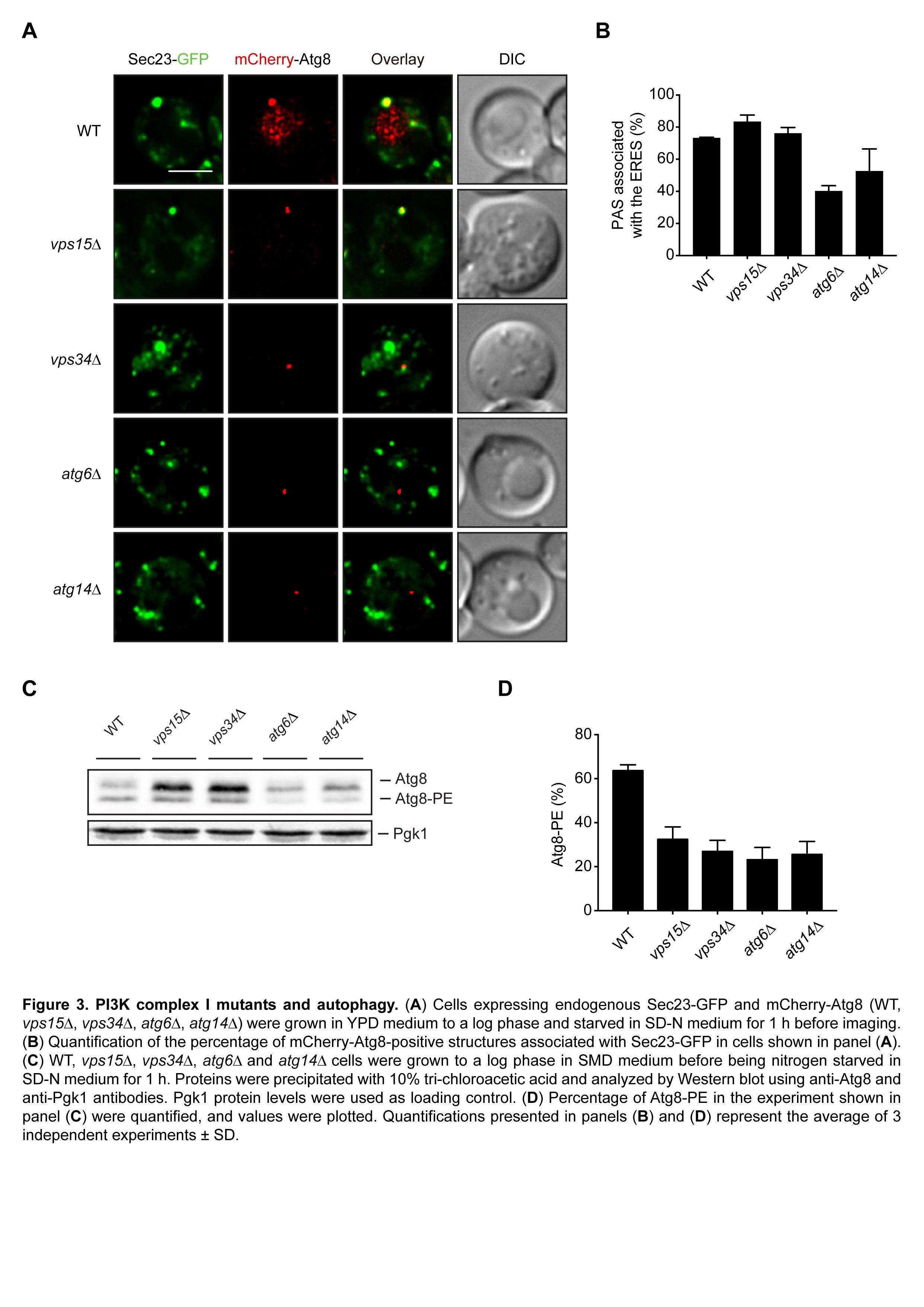 In parallel, I further characterized the PI3K complex I subunit mutants to know whether the PAS proximity to the ERES was affected as well. I concluded that although all the subunits have a role in the association of Atg8 with the autophagosomal membranes, only Atg6 and Atg14 are needed for the PAS positioning in the vicinity of the ERES.