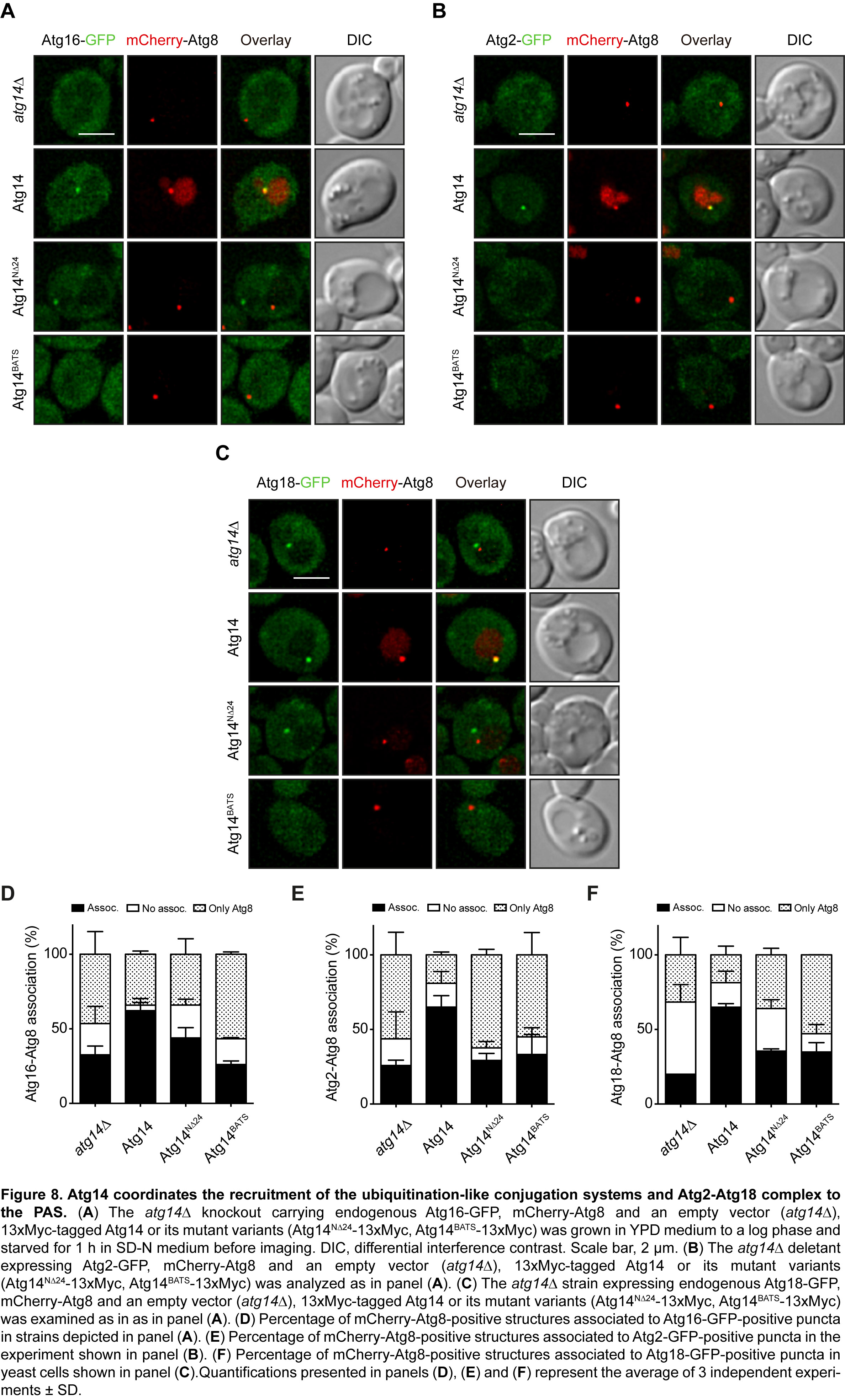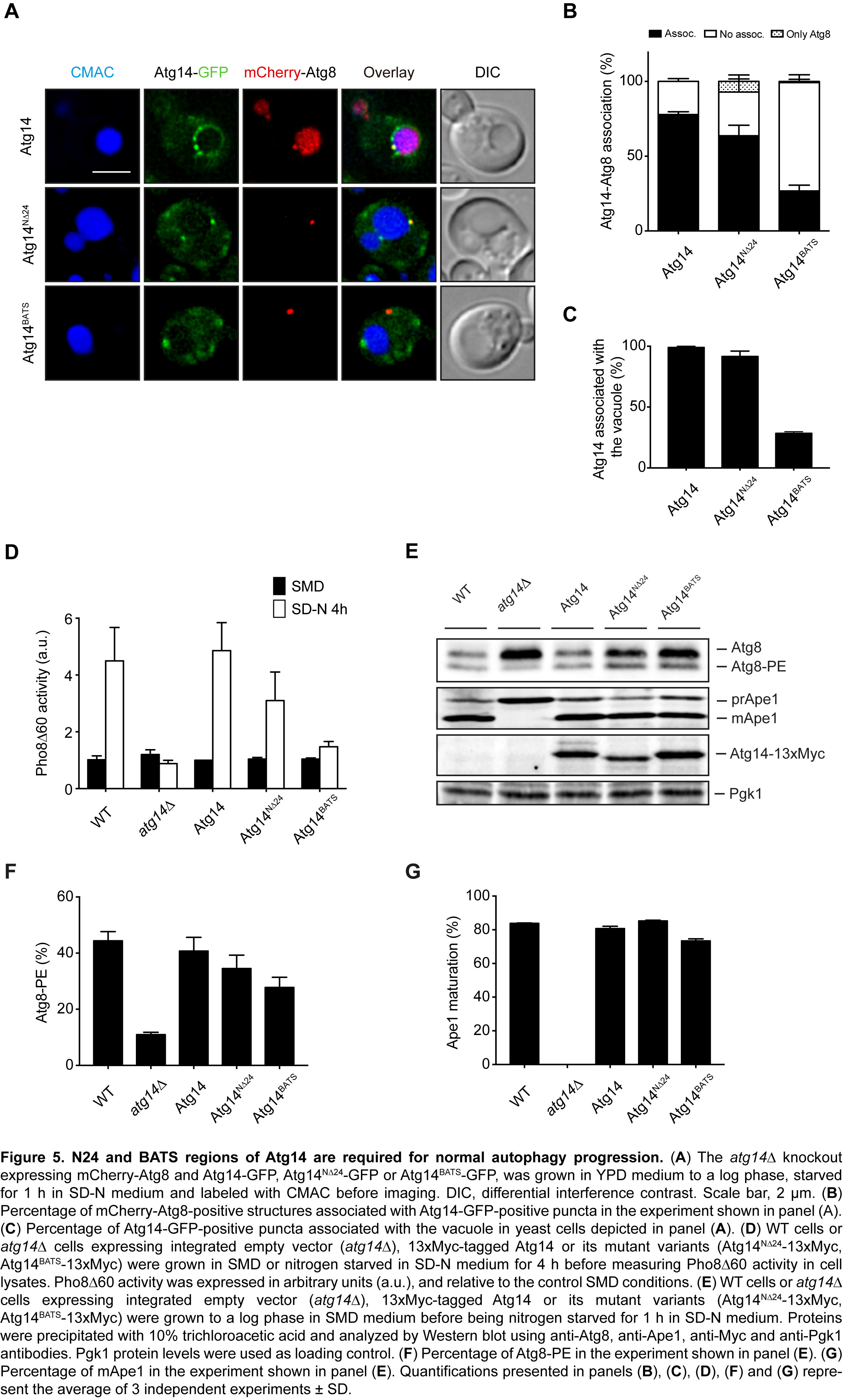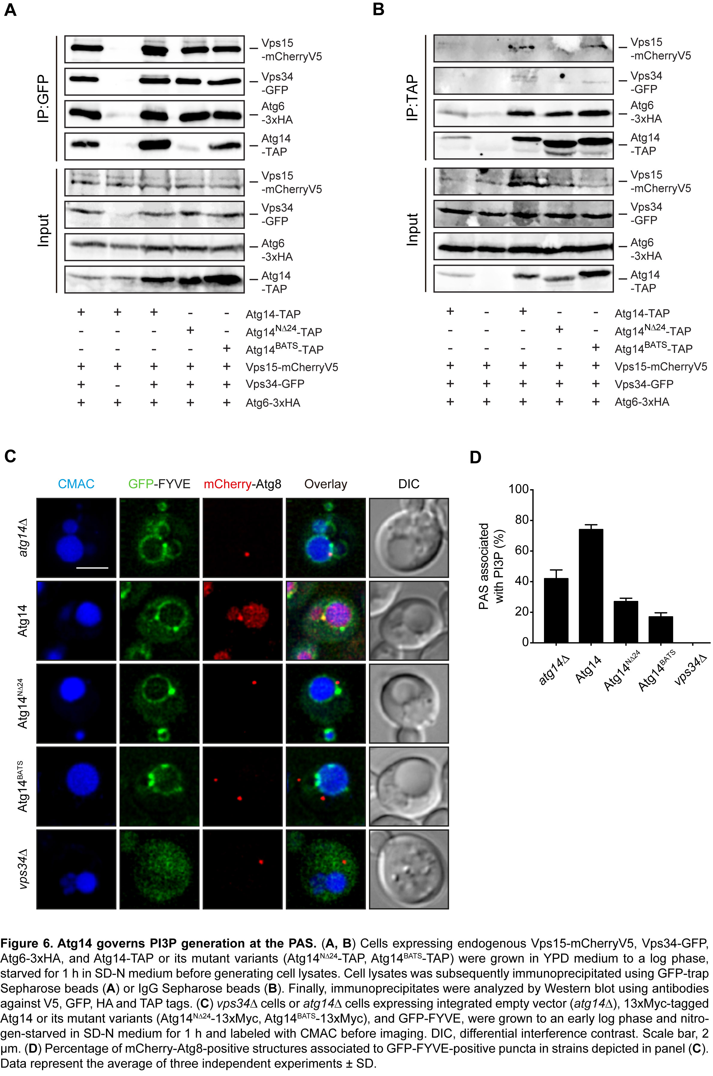 My results do not allow a have comprehensive mechanistic discussion yet, but some important preliminary considerations can be done. The data clearly show that the PI3K complex I, driven by Atg14, play an essential role in the positioning of the Atg machinery during autophagosome formation at the specific region confined between the ER and the vacuole. In this regard, the first 24 amino acids of Atg14 (N24) are required for the association of PAS in the vicinity of the ER, and a C-terminal amphipathic alpha helix (BATS) is needed for the positioning of the PAS to the vacuole. The final aim of this project would be unveil new roles of the PI3K complex I, specifically of Atg14, outside its function of synthesizing PI3P, as for example the organization of the Atg machinery through physical connections.