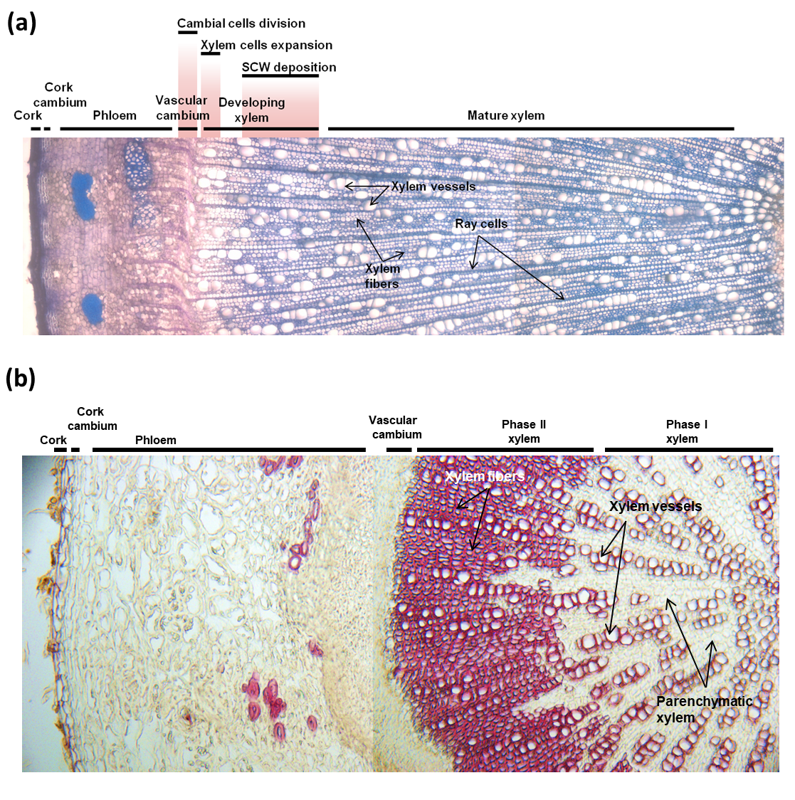 We assessed secondary growth by quantifying the amount of xylem production at the hypocotyl, which is located between the main stem and the root and is the most analogous organ in Arabidopsis to the woody stem of trees (Figure). By associating differences in terms of xylem development with the differences within the genomes of the analysed strains, we found a region of the genome significantly associated with cambial activity. Using further experimentation, we tested all the genes that were contained in the identified genomic region and identified one as a new regulator of secondary growth. To learn more about the specific activity of the new regulator of secondary growth, we performed experimentation that allowed us to determine that such new gene negatively regulates the production of one specific cell-type within the xylem (namely, the fibres) by preventing its precocious formation, thereby ensuring the correct pace of xylem development. In this way, mutants for the gene initiate the formation of fibres earlier in the development than normal plants (the latter usually called wild-type plants). Furthermore, our results suggest that this gene acts through transcriptional repression of previously described xylem fiber differentiation identity genes. The results from WOODSofCHANGE have advanced our understanding about the complex regulation of plant development in general and the genetic control of secondary growth in particular.