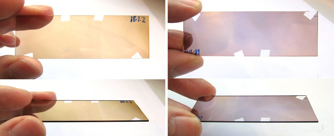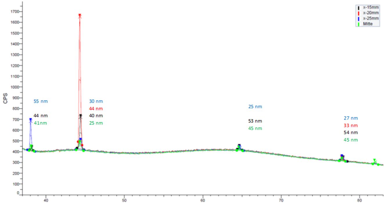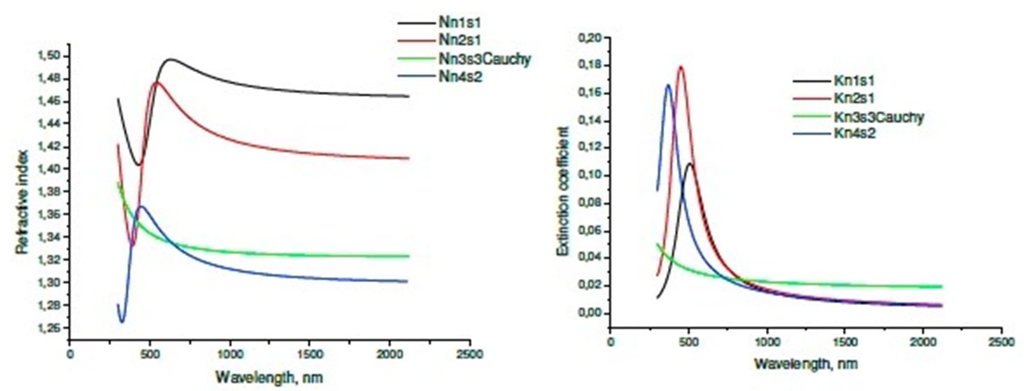 - Nanocomposites coatings (Ag NP in SiO2 matrix, Figure 5) display a plasmonic response (Figure 6). To confirm those results, nanocomposite coatings have been characterized in terms of effective refractive index by Dr. Sytchkova (ENEA, Rome, Figure 7) Plasmon resonance was modeled using double Lorentz oscillator, localized plasmon resonances (LPR) frequency was measured. Samples were characterized by XRD at the University of Applied Sciences Zwickau (Figure 8). The nanoparticle sizes using Scherrer formula were 25 to 55 nm. The interpretation of those results is currently discussed.