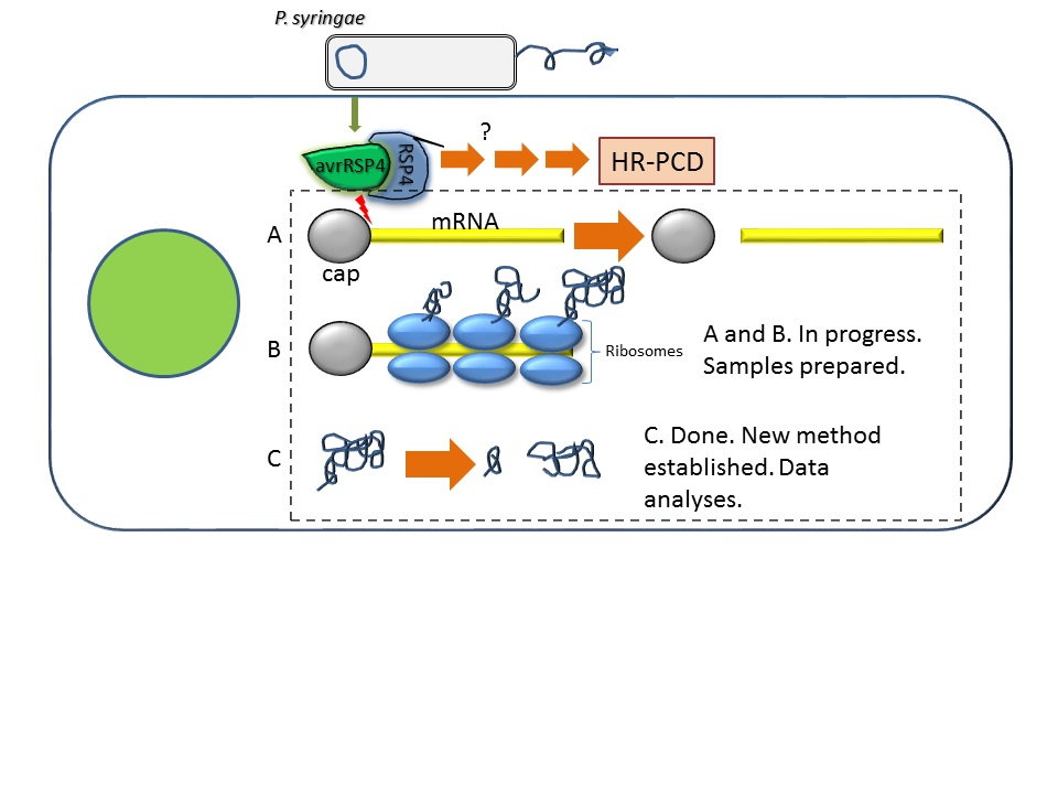 We set up a protocol for analyses of HR-PCD in leaves of Ws-2 and Col-0 plants. We established that the Pseudomonas fluorescence::avrRPS4 represents an excellent pathosystem for our analyses. Yet, we were not able to assay HR-PCD using ion leakage assay, Infiltrated tissues were used for protein and RNA degradomes and polysomes. Samples have been collected and are now analyzed.