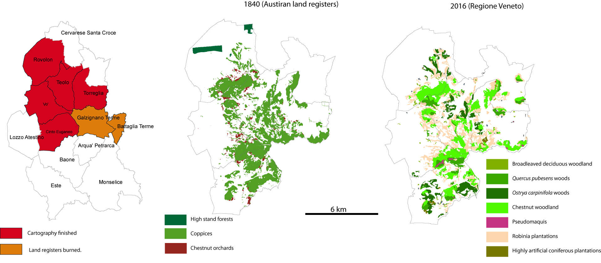Thanks to historical mapping the extension of the forest massifs has been restored (Fig 1). It has revealed a wide dominance of coppices in 19th century forests. Only two forest areas were managed in high forests to provide timber for the Venetian arsenal.