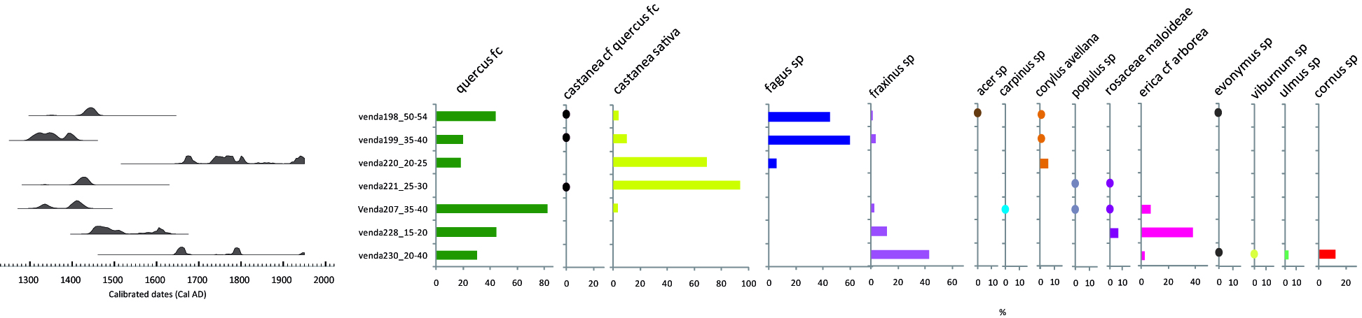 A forest archaeology approach has also been used in order to complete these data. Walking and LIDAR surveys were carried out on the Monte Venda and Monte della Madonna massifs. Through this approach we identified vestiges witnessing forest presence in the past (charcoal platforms), and attesting to an opening of the environment (for example, agricultural terraces and habitats). Each vestige has been mapped to show whether the study area presented forest continuity. To date nearly 40 platforms of charcoal production have been identified (Fig 2). 10 platforms have been analysed. The six radiocarbon dates received date this charcoal production at least in the 14th century, and bear witness to an activity that continues over time, since some charcoal platforms date back to the 15th, 16th, 17th and 19th centuries. Only the depth horizons have been dated so far. Future analyses will focus on testing whether stratigraphy is still conserved on these remains and whether vegetation dynamics over time can be studied from the same platform (Fig 2).