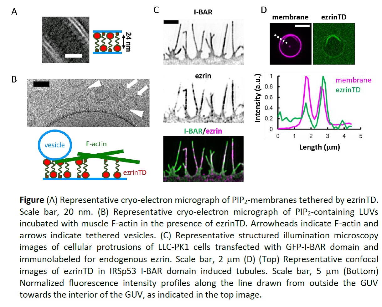 - By using large unilamellar vesicles (LUVs) combined with cryo-electron microscopy (cryo-EM), to our surprise, we observed that both ezrinWT and ezrinTD assemble in an anti-parallel manner to tether adjacent membranes. Furthermore, the distances measured between the centers of the globular domains of the two opposing ezrin molecules sandwiched between the lipid layers were different: 24.1 ± 1.3 nm for ezrinTD and 28.7 ± 1.2 nm for ezrinWT (error bar represents standard deviation).